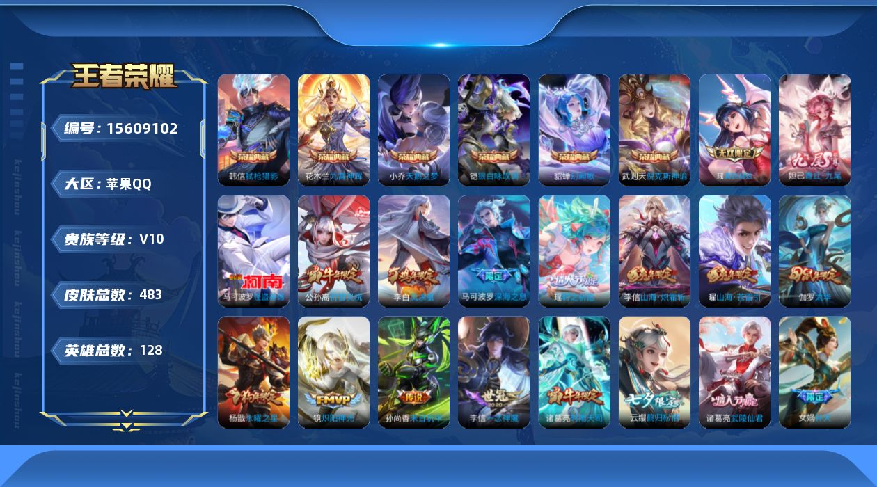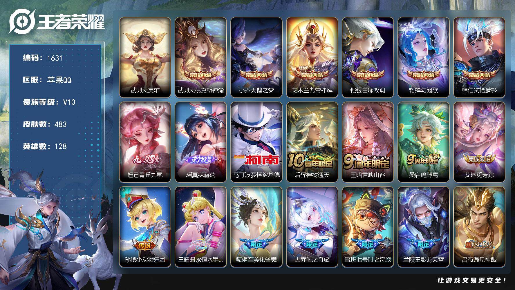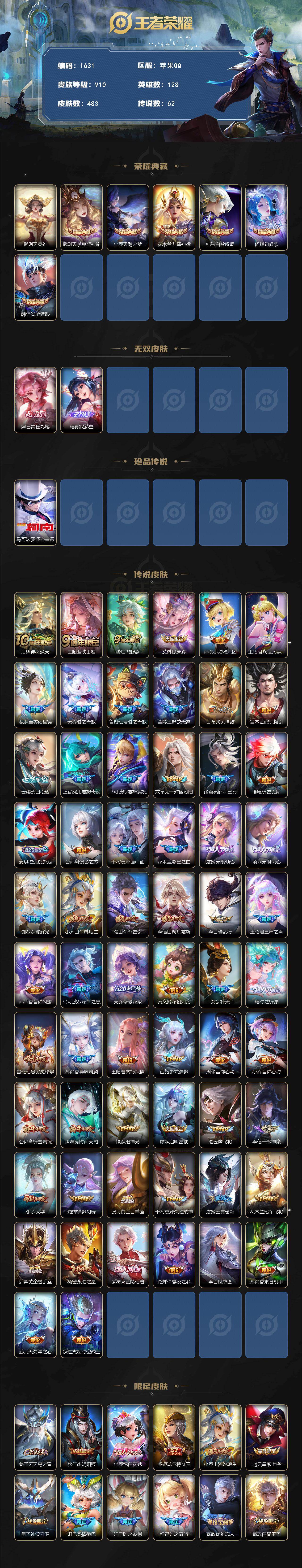 [15609102]【1631】苹果Q-V10-至尊星耀II段位-128英雄-483皮肤-6典藏皮肤-1典藏英雄-2无双-1珍品传说-62传说-168史诗