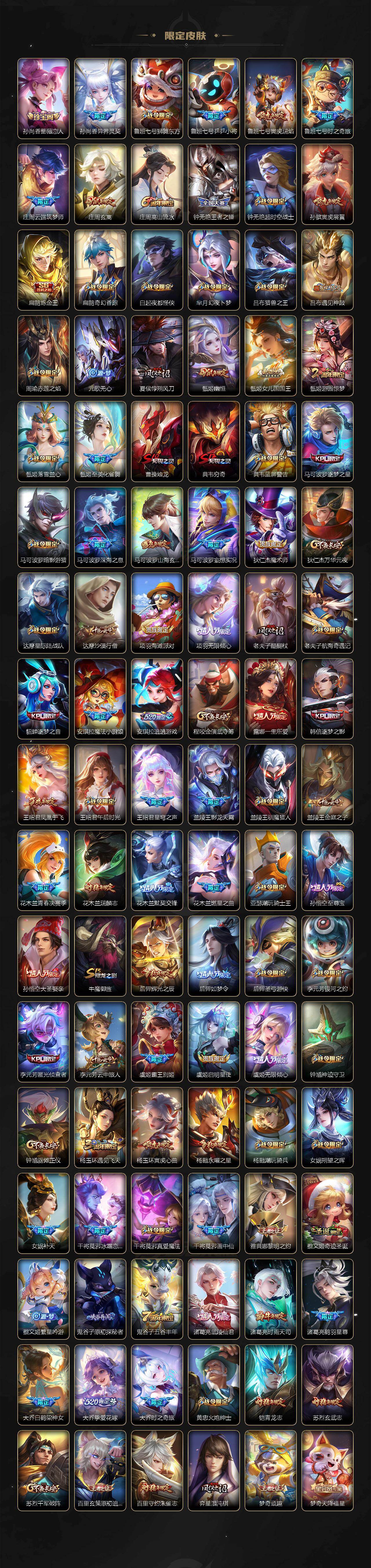 【限定皮肤】:姜子牙天穹之誓,狄仁杰阴阳师,小乔纯白花嫁,虞姬凯尔特女王,小乔山海琳琅生,赵云皇家上将,墨子神迹守卫,妲己热情桑巴,妲己时之彼端,妲己时之奇旅,嬴政优雅恋人,嬴政白昼王子,孙尚香蔷薇恋人,孙尚香异界灵契,鲁班七号狮舞东方,鲁班七号乒乒小将,鲁班七号寅虎瑞焰,鲁班七号时之奇旅,庄周云端筑梦师,庄周玄嵩,庄周高山流水,钟无艳王者之锤,钟无艳超时空战士,孙膑寅虎展翼,扁鹊炼金王,扁鹊奇幻香踪,白起夜都怪侠,芈月幻夜卜梦,吕布猎兽之王,吕布遇见神鼓,周瑜赤莲之焰,元歌无心,夏侯惇朔风刀,甄姬幽恒,甄姬女儿国国王,甄姬游园惊梦,甄姬落雪兰心,甄姬至美化雀舞,曹操烛龙,典韦穷奇,典韦蓝屏警告,马可波罗逐梦之