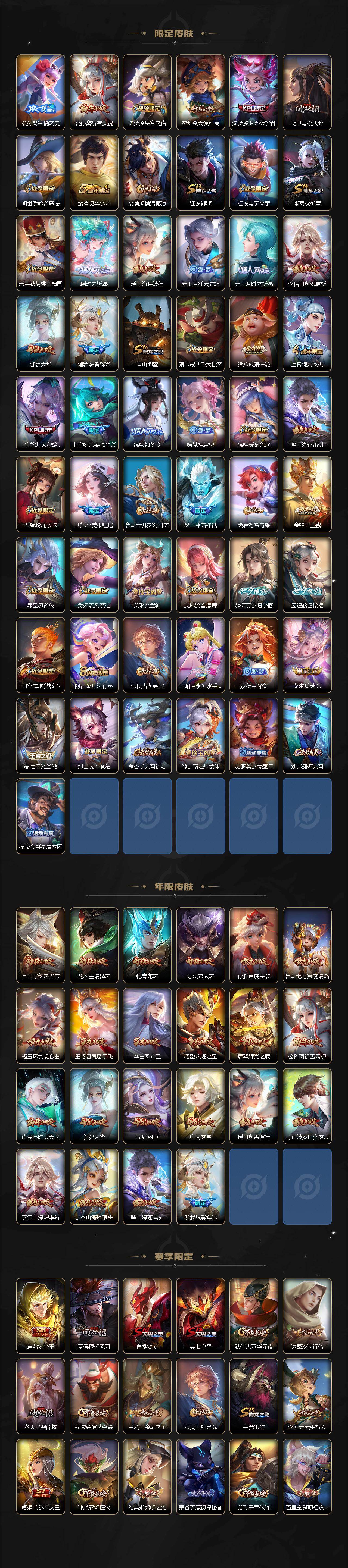裴擒虎李小龙,上官婉儿梁祝,貂蝉逐梦之音,公孙离祈雪灵祝,诸葛亮时雨天司,后羿辉光之辰,庄周玄嵩,甄姬幽恒,伽罗太华,上官婉儿天狼绘梦者,马可波罗逐梦之星,韩信逐梦之影,铠青龙志,花木兰瑞麟志,苏烈玄武志,百里守约朱雀志,王昭君凤凰于飞,虞姬霸王别姬,小乔纯白花嫁,孙悟空大圣娶亲,露娜一生所爱,花木兰默契交锋,后羿如梦令,嫦娥如梦令,孙悟空至尊宝,妲己热情桑巴,干将莫邪冰霜恋舞曲,花木兰青春决赛季,蔡文姬奇迹圣诞,妲己时之彼端,公孙离蜜橘之夏,安琪拉魔法小厨娘,庄周云端筑梦师,鲁班七号乒乒小将,大乔白鹤梁神女,猪八戒猪悟能,孙尚香异界灵契,甄姬女儿国国王,鲁班七号寅虎·瑞焰,孙膑寅虎·展翼,杨玉环寅虎·心曲,云中君时之祈愿,瑶时之祈愿,女娲补天,马可波罗深海之息,金蝉唐三藏,妲己时之奇旅,王昭君星穹之声,李白诗剑行,马可波罗山海·玄木吟,盘古冰霜神祇,瑶山海·碧波行,兰陵王影龙天霄,西施至美·乘鲤谣,甄姬至美·化雀舞,桑启鸣野蒿,王昭君映山客