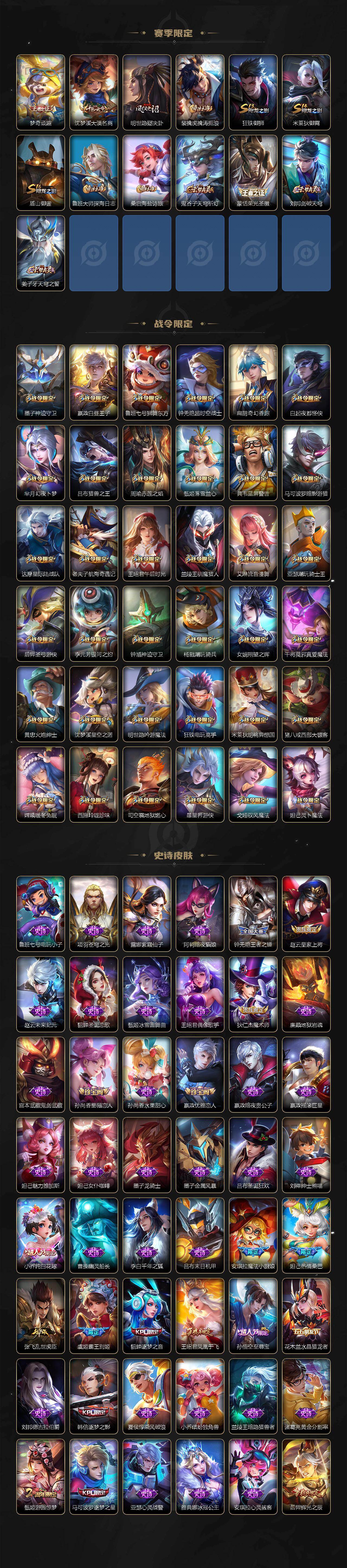 扁鹊炼金王,虞姬凯尔特女王,曹操烛龙,典韦穷奇,狂铁御狮,米莱狄御霄,牛魔御旌,盾山御銮,夏侯惇朔风刀,明世隐疑决卦,老夫子醍醐杖,鬼谷子原初探秘者,狄仁杰万华元夜,程咬金演武夺筹,钟馗驱傩正仪,苏烈千军破阵,吕布猎兽之王,嬴政白昼王子,女娲朔望之晖,典韦蓝屏警告,钟馗神迹守卫,鲁班七号狮舞东方,沈梦溪星空之诺,李元芳银河之约,马可波罗暗影游猎,弈星混沌棋,达摩沙漠行僧,兰陵王金庭之子,沈梦溪大漠名商,李元芳云中旅人,桑启海盐诗旅,裴擒虎擒涛扼浪,鲁班大师探海日志,张良古海寻踪