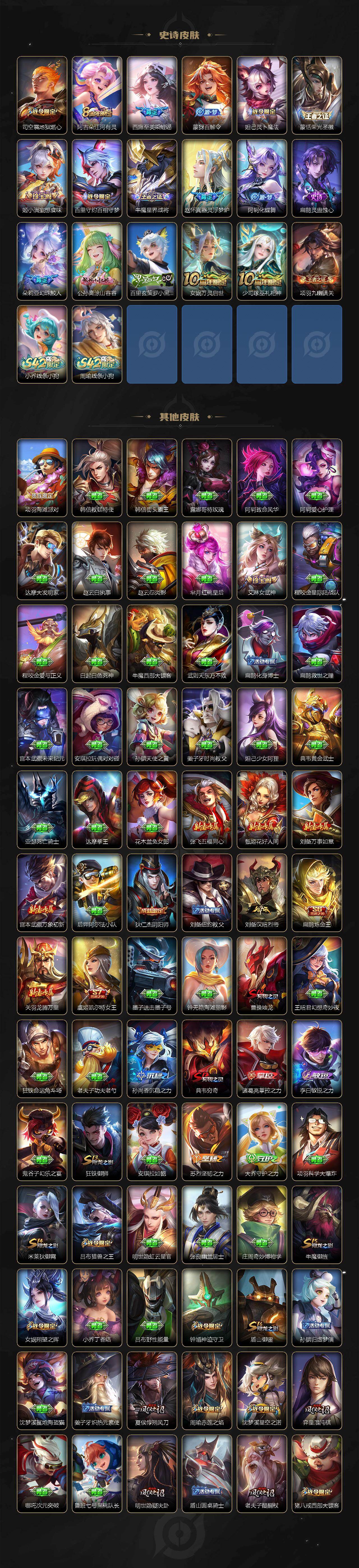 【传说皮肤】:后羿神树通天,王昭君映山客,桑启鸣野蒿,艾琳觅芳踪,孙膑小动物乐团,王昭君永恒水手月亮,甄姬至美化雀舞,大乔时之奇旅,鲁班七号时之奇旅,兰陵王影龙天霄,吕布遇见神鼓,宫本武藏惊梅引,云缨鹤归松栖,上官婉儿妄想奇谈,马可波罗妄想实况,东皇太一灼幽烈阳,诸葛亮鹤羽星尊,澜电玩雷克斯,安琪拉追逃游戏,公孙离记忆之芯,干将莫邪画中仙,花木兰燃星之曲,虞姬无限倾心,项羽无限倾心,伽罗炽翼辉光,小乔山海琳琅生,曜山海苍雷引,李信山海炽霜斩,李白诗剑行,王昭君星穹之声,孙尚香音你闪耀,马可波罗深海之息,大乔挚爱花嫁,蔡文姬花朝如约,女娲补天,瑶时之祈愿,鲁班七号寅虎瑞焰,孙尚香异界灵契,王昭君乞巧织情,西施游龙清影,周瑜音你心动,小乔音你心动,公孙离祈雪灵祝,诸葛亮时雨天司,镜炽阳神光,虞姬启明星使,曜云鹰飞将,李信一念神魔,伽罗太华,貂蝉猫影幻舞,张良黄金白羊座,干将莫邪久胜战神,虞姬云霓雀翎,花木兰冠军飞将,后羿黄金射手座,杨戬永曜之星,诸葛亮武陵仙君,貂蝉仲夏夜之梦,李白凤求凰,孙尚香末日机甲,武则天海洋之心,狄仁杰超时空战士