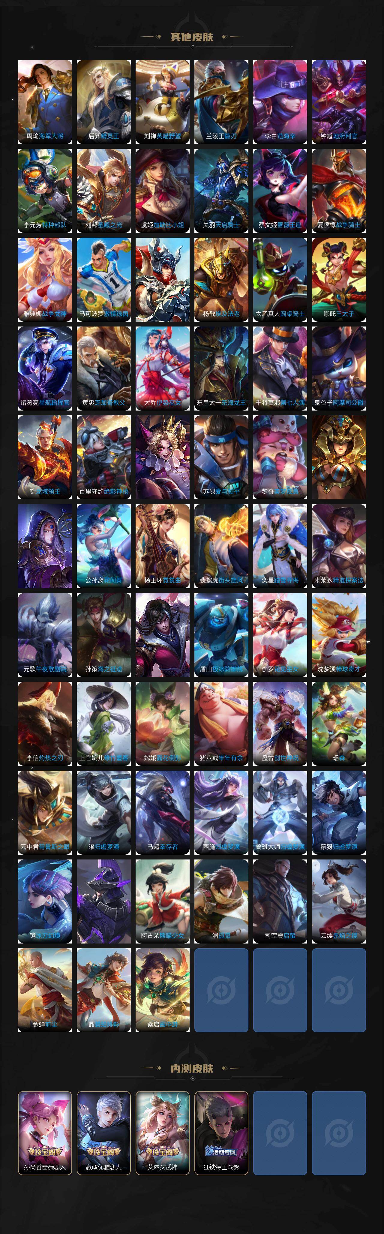 小乔青蛇,大乔白蛇,瑶遇见神鹿,娜可露露晚萤,伽罗箭羽风息,李元芳逐浪之夏,不知火舞魅语,公孙离无限星赏官,大乔猫狗日记,孙策猫狗日记,阿轲节奏热浪,露娜紫霞仙子,诸葛亮黄金分割率,王昭君偶像歌手,项羽苍穹之光,孙尚香时之恋人,阿轲暗夜猫娘,雅典娜冰冠公主,吕布末日机甲,鲁班七号电玩小子,橘右京修罗,墨子龙骑士,嬴政摇滚巨星,刘禅绅士熊喵,刘禅天才门将,白起星夜王子,安琪拉心灵骇客,安琪拉时之奇旅,程咬金功夫厨神,刘邦德古拉伯爵,兰陵王暗隐猎兽者,曹操幽灵船长,宫本武藏鬼剑武藏,司马懿暗渊魔法,亚瑟心灵战警,杨戬天秀·启明,蔡文姬舞动绿茵,廉颇地狱岩魂,西施诗语江南,小乔缤纷独角兽,夏侯惇乘风破浪,花木兰水晶猎龙者,铠曙光守护者,百里玄策热力回旋,墨子金属风暴,百里玄策原初追逐者,吕布圣诞狂欢,貂蝉圣诞恋歌,百里守约特工魅影,嬴政暗夜贵公子,嫦娥拒霜思,雅典娜黎明之约,李白千年之狐,夏洛特永昼,澜赏金猎手,艾琳奇遇舞章,貂蝉唤灵魅影,张良千筹问战,弈星滕王阁序,杨玉环银翎春语,沈梦溪匿光破解者,蔡文姬电玩·兔顽号,刘禅电玩·爆裂旋风,海月浮梦罗烟,镜真我赫兹,百里守约真我赫兹,赵怀真鹤归松栖,莱西奥末日机甲,李元芳匿光侦查者,蒙犽百解令,赵怀真器灵·浮梦炉