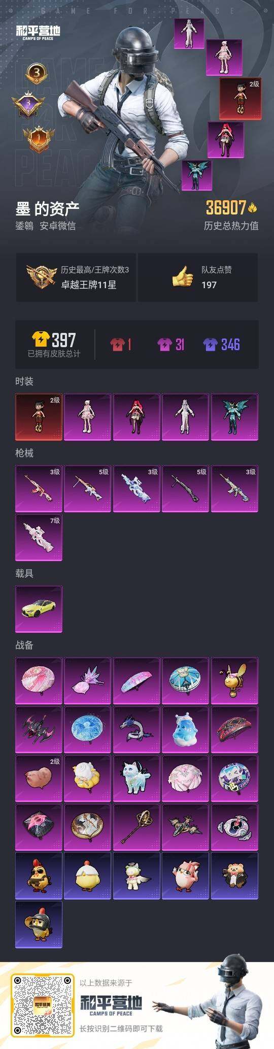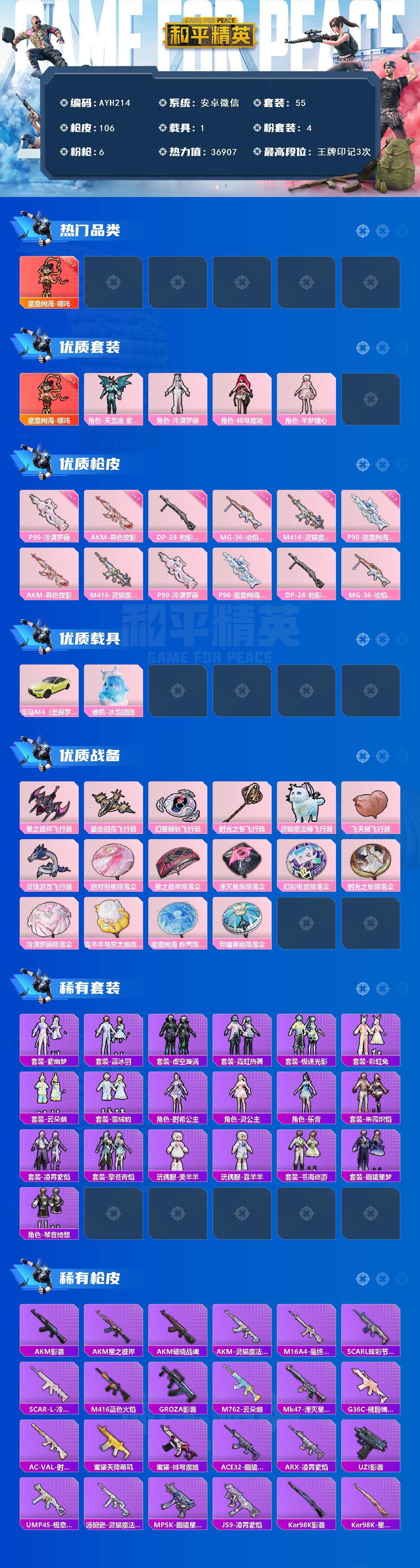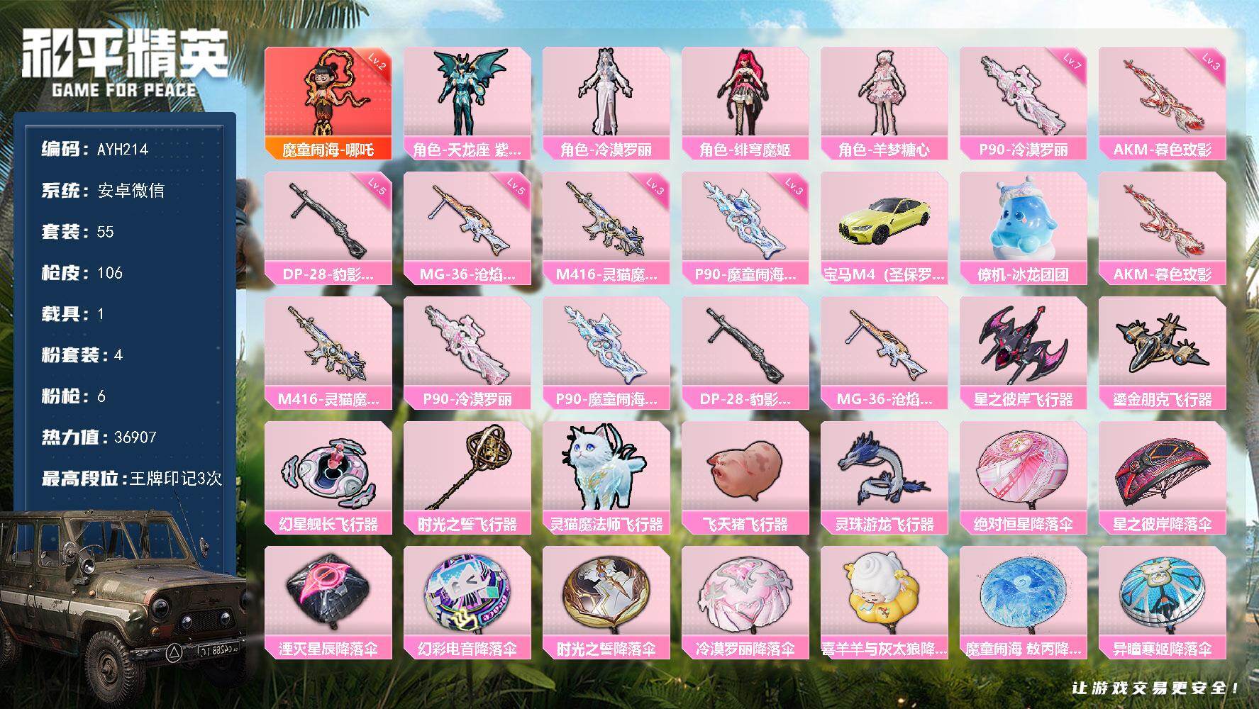 [15611737]安卓 微信-1神装-4粉装-6特效枪-1载具-9粉色飞行器-36907热力值-3王牌印记-55套装-106枪皮