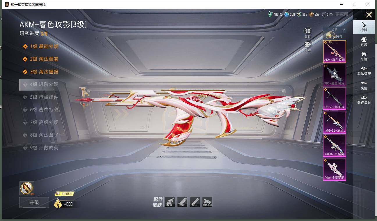 【粉色枪皮等级】:AKM-暮色玫影(三级),M416-灵猫魔法师(三级),P90-冷漠罗丽(七级),P90-魔童闹海 敖丙(三级),DP-28-豹影疾电(五级),MG-36-沧焰双生(五级)