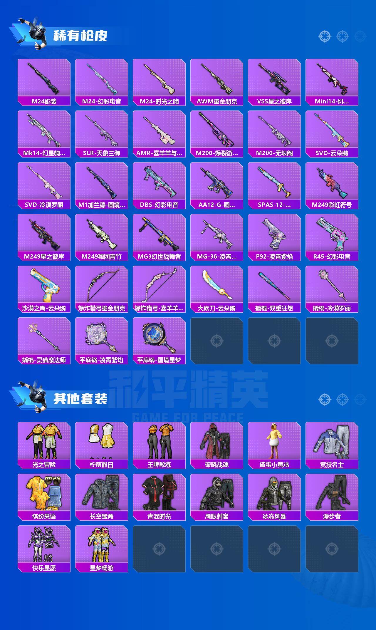 【稀有枪皮】:AUG-冰晶雪宝,AKM-影袭,AKM-星之彼岸,AKM-破晓战魂,AKM-灵猫魔法师,M16A4-最终圣卫者,SCAR-L-炫彩节奏,SCAR-L-冷漠罗丽,M416-蓝色火焰,GROZA-影袭,M762-云朵鹅,Mk47-湮灭星辰,G36C-桃粉嫣然,AC-VAL-时光之吻,蜜獾-天降萌叽,蜜獾-绯穹魔姬,ACE32-画境星梦,ARX-凌霄紫焰,UZI-影袭,UMP45-极意拳锋,汤姆逊-灵猫魔法师,MP5K-画境星梦,JS9-凌霄紫焰,Kar98K-影袭,Kar98K-星穹咏叹调,M24-影袭,M24-幻彩电音,M24-时光之吻,AWM-鎏金朋克,VSS-星之彼岸,Mini14-绯穹魔姬,Mk14-幻星舰长,SLR-天象三御,AMR-喜羊羊与灰太狼,M200-无垠阁,M200-爆裂