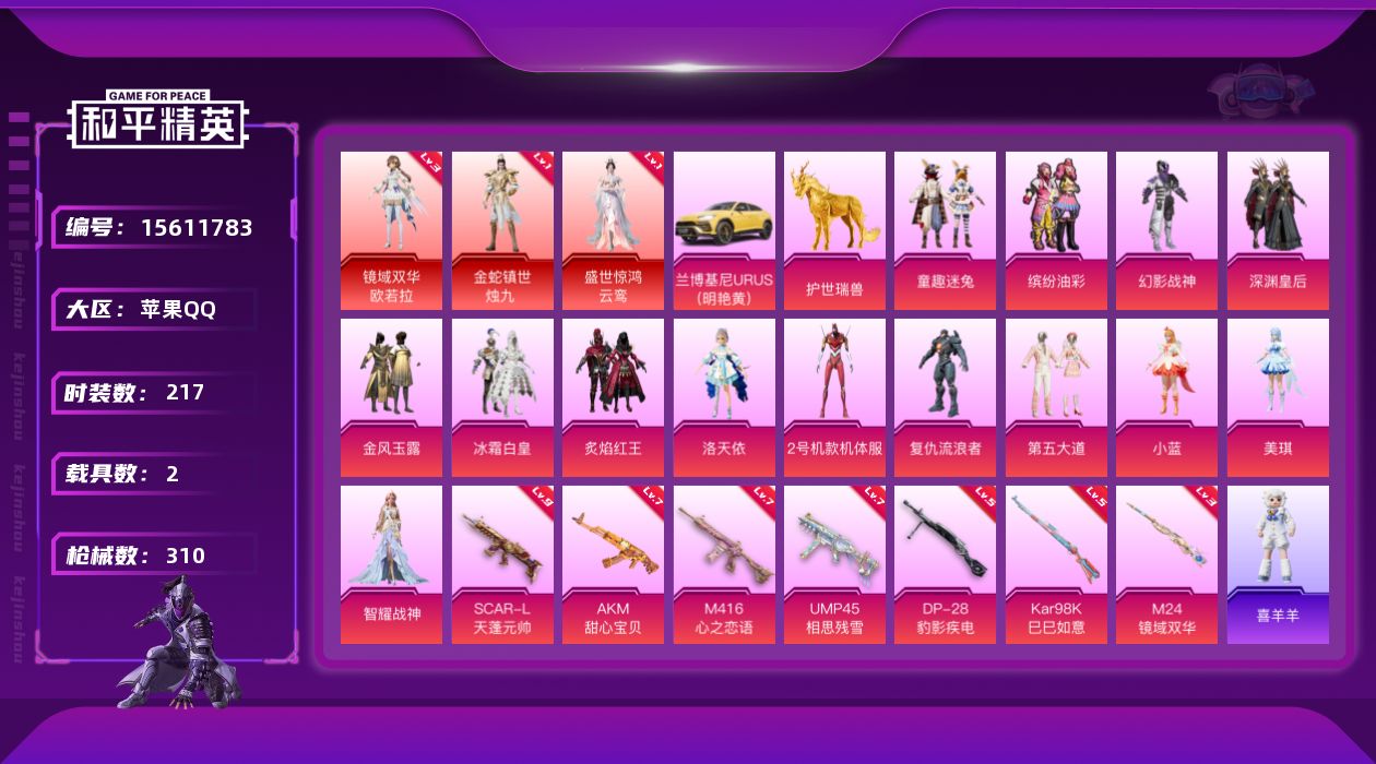 [15611783]素材身法号/无敌战神框1/绝世印记4/SCAR-L-天蓬元帅(九级)【特价急出/详情看图】:苹果 手Q-无敌战神框-3神装-14粉装-7特效枪-2载具-9粉色飞行器-11.1w热力值-20王牌印记-217套装-310枪皮【红色神装等级】:金蛇镇世-烛九(一级),盛世惊鸿-云鸾(一级),镜域双华-欧若拉(三级)【热门品类】:粉装-童趣迷兔,粉装-缤纷油彩,套装-SS1特训,套装-龟仙人,套装-软软马卡龙,小恶魔头饰,熔岩游骑兵面罩,熔岩游骑兵连帽夹克,套装-红熊茄茄【粉色载具】:兰博基尼URUS(明艳黄),护世瑞兽【粉色套装】:粉装-幻影战神,粉装-深渊皇后,粉装-金风玉露,粉装-缤纷油彩,粉装-冰霜白皇,粉装-童趣迷兔,粉装-炙焰红王,角色-洛天依,角色-2号机款机体服,角色-复仇流浪者,粉装-第五大道,角色-小蓝,角色-美琪,角色-智耀战神【粉色枪皮等级】:AKM-甜心宝贝(七级),SCAR-L-天蓬元帅(九级),M416-心之恋语(七级),UMP45-相思残雪(七级),Kar98K-巳巳如意(五级),M24-镜域双华(三级),DP-28-豹影疾电(五级)【粉色飞行器】:酣梦熊熊飞行器,相思残雪飞行器,齐天大圣飞行器,繁龙极客飞行器,镜域双华-灵镜之阶,龙翔九天飞行器,脆鲨七海飞行器,万象金身飞行器