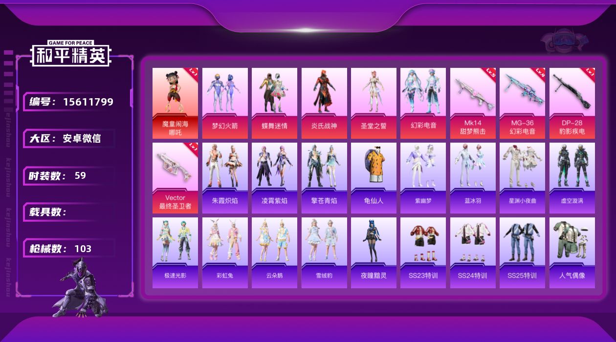 [15611799]特价急出-1414个神装碎片可随意悦换-安卓-1神装-5粉装-4特效枪-0载具-4粉色飞行器-29962热力值-1王牌印记-59套装-103枪皮
