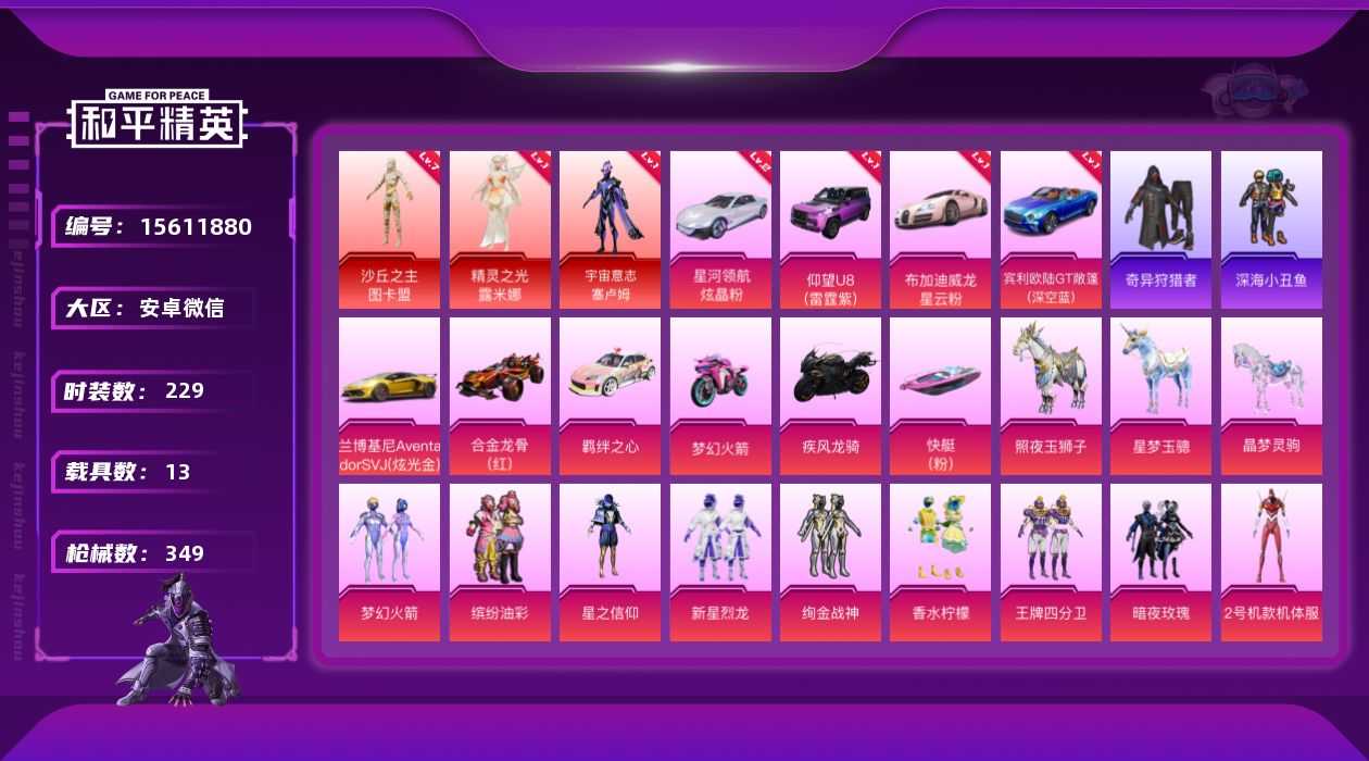[15611880]满级图卡盟3红装随意切换/满级墨龙九天/4红车布加迪宾利仰望/U8星河领航安卓 微信-3神装-23粉装-27特效枪-13载具-11粉色飞行器-181594热力值-24王牌印记-229套装-349枪皮