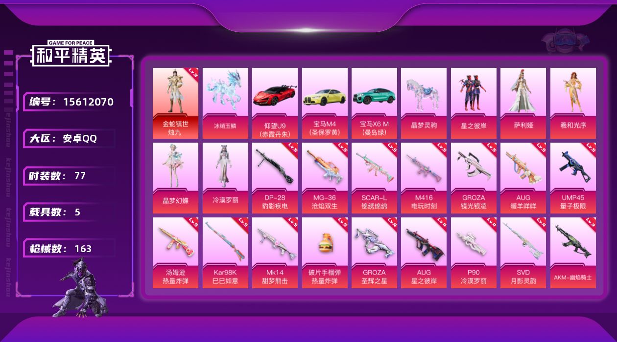 [15612070]【店主推荐捡漏号!可直接换绑】/素材身法号/地铁满天赋 安卓 手Q-1神装-5粉装-19特效枪-5载具-6粉色飞行器-5.7w热力值-3王牌印记-77套装-163枪皮【红色神装等级】:金蛇镇世-烛九(三级)【热门品类】:角色-Mark.06【粉色载具】:仰望U9(赤霞丹朱),宝马M4(圣保罗黄),宝马X6 M(曼岛绿),晶梦灵驹,冰绡玉鳞【粉色套装】:粉装-星之彼岸,角色-萨利娅,角色-羲和光序,角色-晶梦幻蝶,角色-冷漠罗丽【粉色枪皮等级】:AKM-幽焰骑士(三级),M16A4-晶梦幻蝶(二级),SCAR-L-锦绣绵绵(五级),SCAR-L-金蛇镇世(三级),M416-电玩时刻(五级),GROZA-镜光银凌(五级),GROZA-圣辉之星(四级),AUG-星之彼岸(四级),AUG-暖羊咩咩(五级),UMP45-量子极限(五级),汤姆逊-星月云朵(二级MK12-雪月幻音),汤姆逊-热量炸弹(五级),P90-冷漠罗丽(四级),Kar98K-巳巳如意(五级),Mk14-甜梦熊击(五级),SVD-月影灵韵(四级),DP-28-豹影疾电(五级),MG-36-沧焰双生(五级),破片手榴弹-热量炸弹(五级)【粉色飞行器】:曦光华影飞行器,幽焰列车飞行器,凤舞九天飞行器,万象金身飞行器,灵猫魔法师飞行器