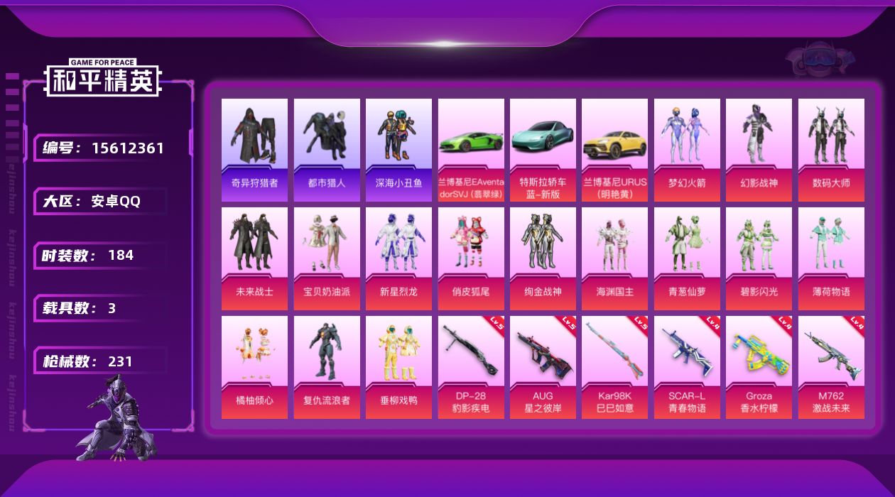 [15612361]安卓 手Q-15粉装-12特效枪-3载具-3粉色飞行器-90573热力值-14王牌印记-184套装-231枪皮