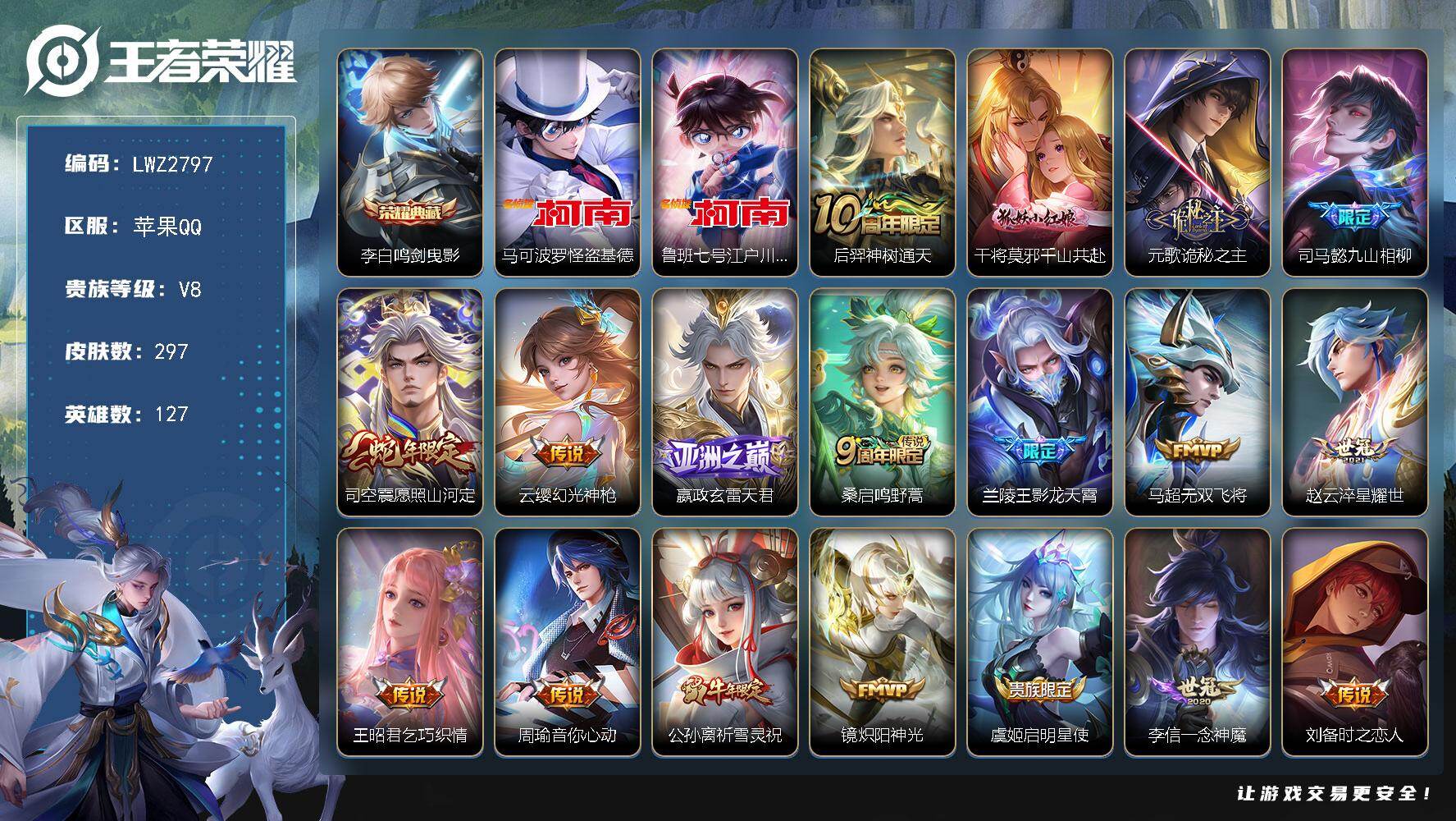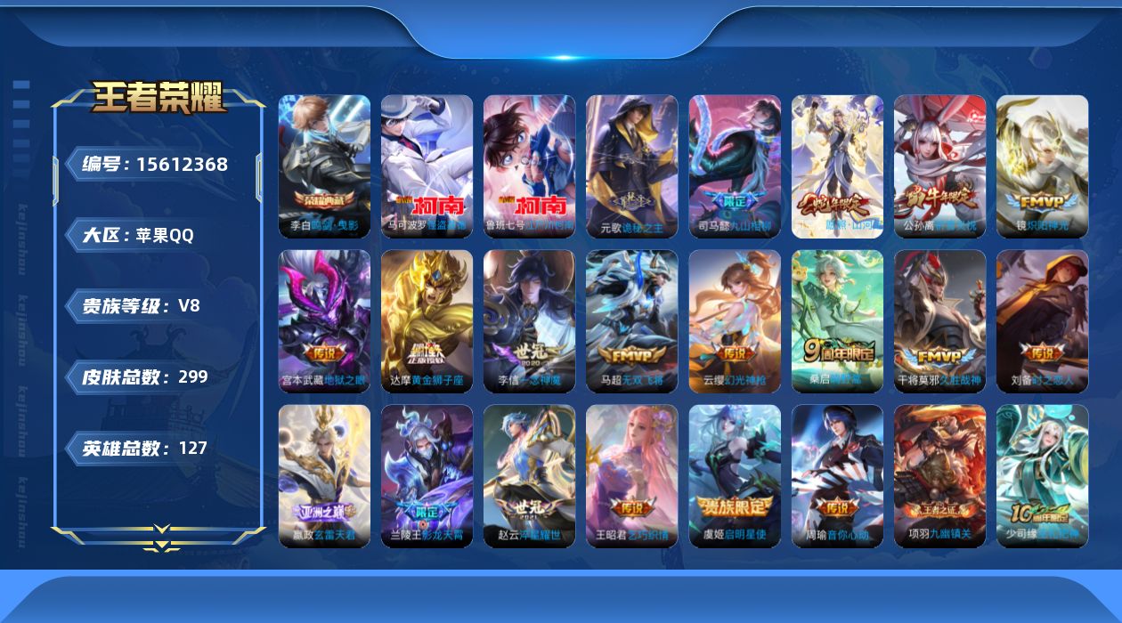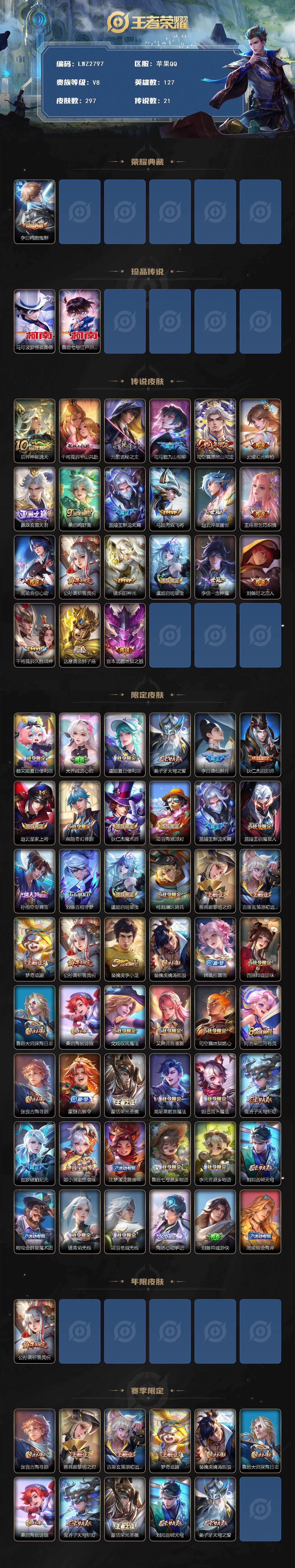 [15612368]【特价出售/店主推荐】 苹果Q-V8-最强王者段位-127英雄-297皮肤-1典藏皮肤-2珍品传说-21传说-89史诗