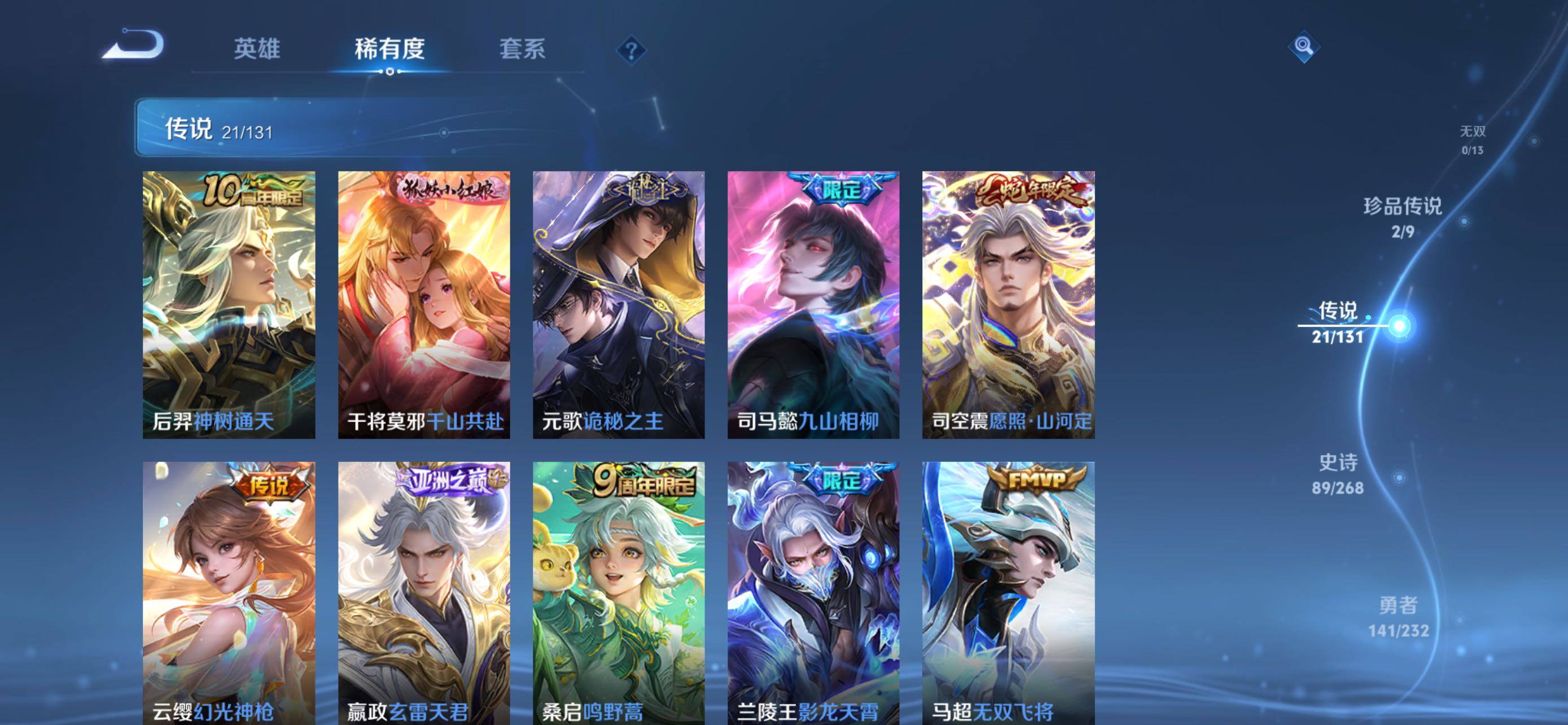 【传说皮肤】:后羿神树通天,干将莫邪千山共赴,元歌诡秘之主,司马懿九山相柳,司空震愿照山河定,云缨幻光神枪,嬴政玄雷天君,桑启鸣野蒿,兰陵王影龙天霄,马超无双飞将,赵云淬星耀世,王昭君乞巧织情,周瑜音你心动,公孙离祈雪灵祝,镜炽阳神光,虞姬启明星使,李信一念神魔,刘备时之恋人,干将莫邪久胜战神,达摩黄金狮子座,宫本武藏地狱之眼