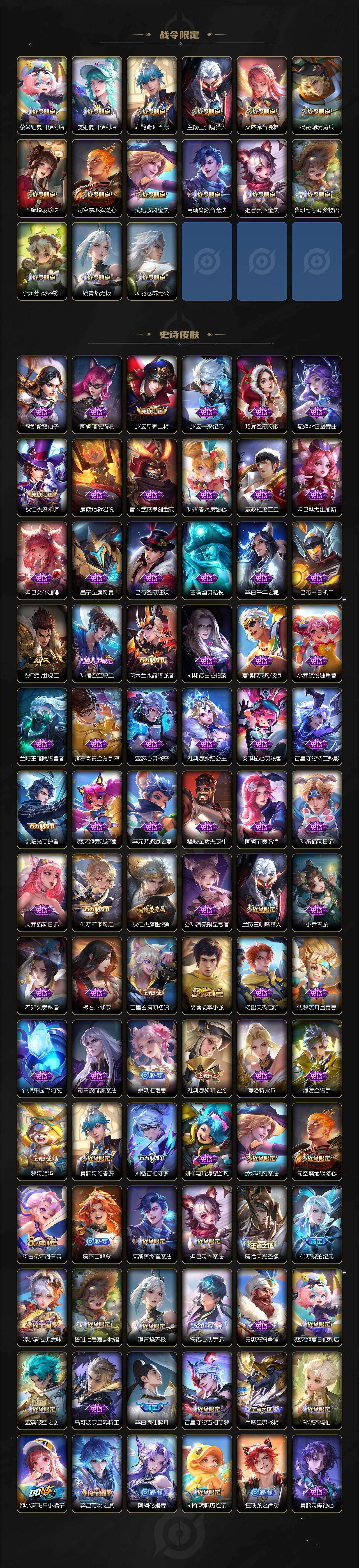 【战令限定】:蔡文姬夏日便利店,虞姬夏日便利店,扁鹊奇幻香踪,兰陵王驯魔猎人,艾琳流音漫舞,杨戬潮玩骑兵,西施玲珑珍味,司空震地狱燃心,戈娅驭风魔法,高渐离燃音魔法,妲己灵卜魔法,鲁班七号蔬乡物语,李元芳蔬乡物语,镜青焰无极,项羽苍威无极