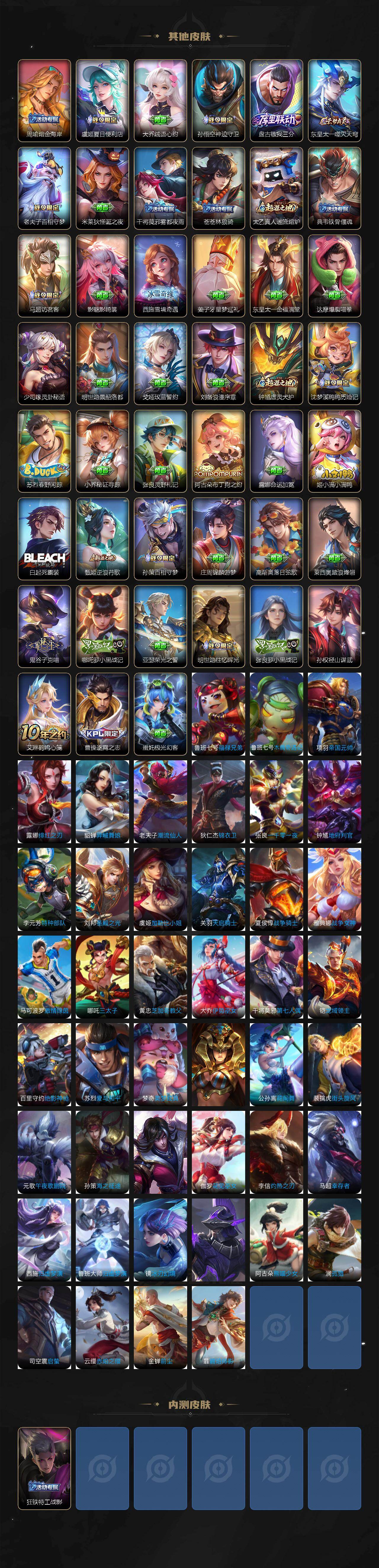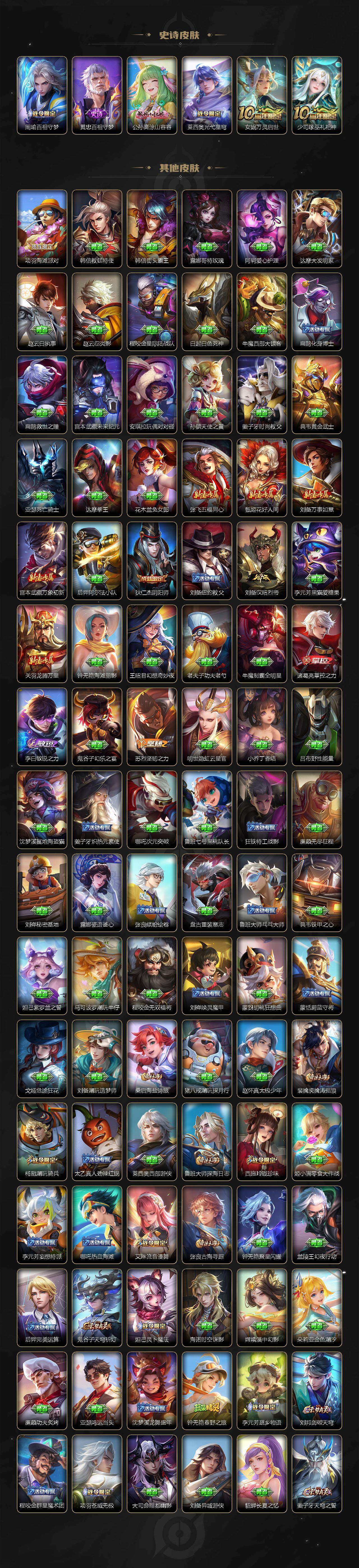 小乔青蛇,伽罗箭羽风息,李元芳逐浪之夏,不知火舞魅语,公孙离无限星赏官,大乔猫狗日记,孙策猫狗日记,阿轲节奏热浪,露娜紫霞仙子,诸葛亮黄金分割率,阿轲暗夜猫娘,雅典娜冰冠公主,吕布末日机甲,橘右京修罗,嬴政摇滚巨星,安琪拉心灵骇客,程咬金功夫厨神,刘邦德古拉伯爵,兰陵王暗隐猎兽者,曹操幽灵船长,宫本武藏鬼剑武藏,司马懿暗渊魔法,亚瑟心灵战警,钟馗乐园奇幻夜,杨戬天秀·启明,蔡文姬舞动绿茵,廉颇地狱岩魂,小乔缤纷独角兽,夏侯惇乘风破浪,花木兰水晶猎龙者,铠曙光守护者,墨子金属风暴,百里玄策原初追逐者,吕布圣诞狂欢,貂蝉圣诞恋歌,百里守约特工魅影,嫦娥拒霜思,雅典娜黎明之约,李白千年之狐,夏洛特永昼,澜赏金猎手,刘备百相守梦,刘禅电玩·爆裂旋风,蒙犽百解令,高渐离燃音魔法,伽罗琥珀纪元,海诺心动手记,李白谪仙醉月,姬小满飞车小橘子