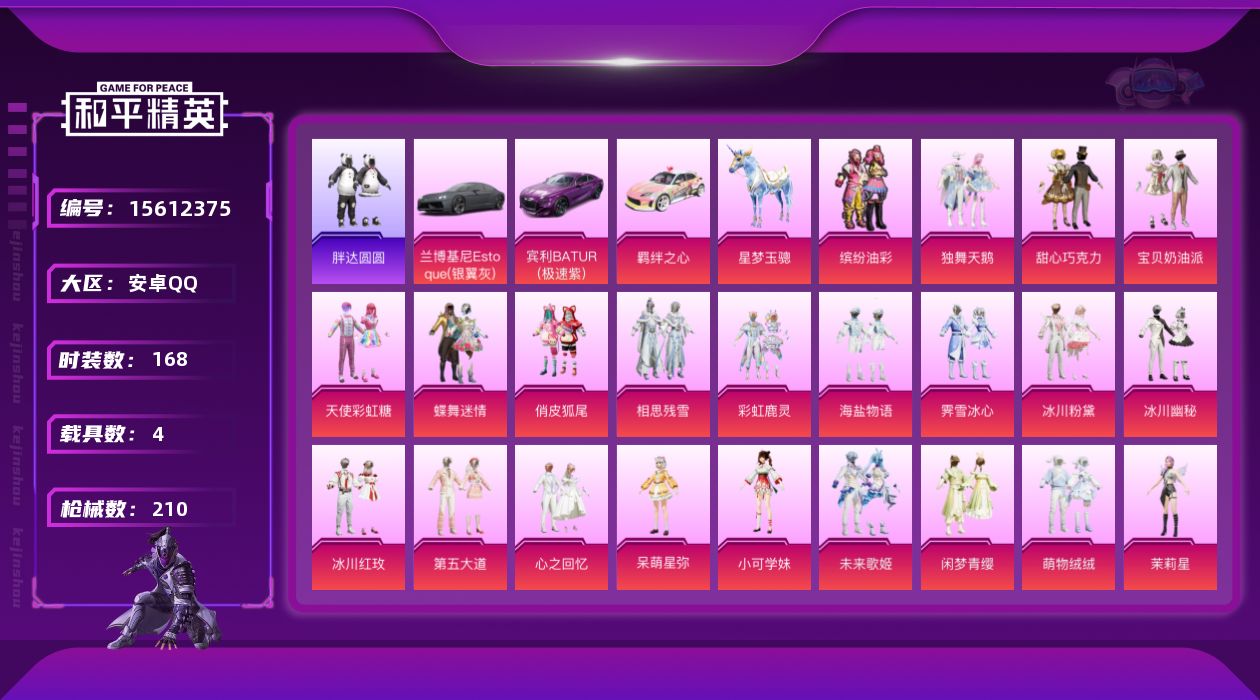 - [11817866]11粉装 8特效枪 3载具 14印记 可二次 可修改实名 身法装备:PAI追光队服 优质装备:护世瑞兽,兰博基尼Estoque(银翼灰),迈凯伦570S(天际蓝),梦幻火箭(新101)(新火箭少女101粉色套装),M416全功率超战,星之彼岸,Vector飒粉甜心,AKM绿萝繁花,SCAR-L-锦绣绵绵,千金淑猫,SCAR-L金蛇镇世,AUG-暖羊咩咩,Kar98K-圣域龙灵,Kar98K-巳巳如意 热门装扮:傲雪凌霜,冰川粉黛,冰川红玫,超级赛亚人贝吉塔,黄族统领,呆萌星弥,白勺歌姬,小可学妹,宙之时溯,鹰眼刺客,深海小丑鱼,暗夜魅影 载具:僚机-萌兔起飞 六级特效枪:六级M416-全功率超战,六级Vector-飒粉甜心 五级特效枪:五级Kar98K-巳巳如意,五级AUG-暖羊咩咩,五级SCAR-L-锦绣绵绵,五级AKM-绿萝繁花 三级特效枪:三级SCAR-L金蛇镇世 二级特效枪:二级Kar98K-圣域龙灵 紫色装扮:SS22特训,莱茵河畔,孙悟空,SS23特训,幻彩翩翩,妙红点点,娇憨猪猪,萌趣咩咩,SS21特训,SS31特训套装,人气偶像,千禧之恋,旭日情侣,SS30特训套装,SS33特训套装,青涩时光,顶瓜瓜,SS20特训,SS16特训,星梦畅游,特种颜团子,军刀雅典娜,英勇保护者,竞技角斗士,瑞龙福将,团圆交子,SS17特训,都市魅力,酒红色名流,长空猛禽,霓虹街区,青年教官,缤纷果语,耀眼新星,荣耀,蓝彩潮人,蓝色运动,虎虎生威吉莉,街头潮人,魅力单车,黄色伏地魔,黄色名流,黄色运动,黑色伏地魔,龙的传人,龟仙人,冰河战士,龙魂突击队,蝶变,格斗先锋,橘黑制服,沙漠兵团,海岛探路者,涂山之恋,深蓝色名流,坚韧舞者,完美偶像,帅气教官,战地督导,战地菁英,湖蓝色名流,绮丽涂鸦,甜蜜菠萝,白熊同盟,白色伏地魔,破晓战魂,福星高照,空岛之星,竞技达人朋克,红色运动,牛气满满,猛禽,猎鹰,短笛,SS29特训,SS28特训,异域银装,鱼渊荷华,玉兔迎春,燕燕于飞,巳巳如意,森林游猎者,青团波波,糖糖葫芦,棉花软糖,竞技名士,街头风暴,临安公主,怀庆长公主,净心行者,PAI追光队服,RSG追光队服,深海梦境,惊鸿侠骨,贝吉塔,究极悟饭,甜梦熊熊,神气柴柴,懵萌河马,SS24特训(SS24特训套装),绚紫流光,SS25特训,锦衣飞扬,粉红小猪,SS27特训,无暇誓言