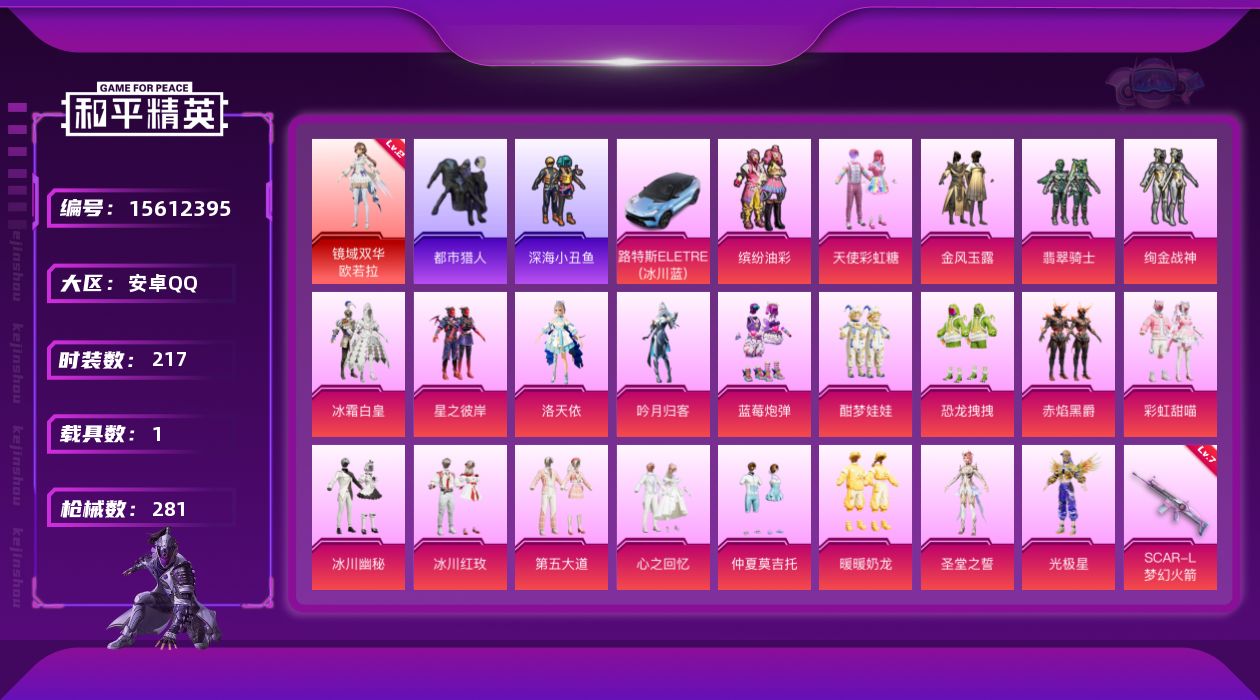 [15612395]满天赋-安卓 手Q-1神装-22粉装-9特效枪-1载具-8粉色飞行器-109060热力值-18王牌印记-217套装-281枪皮
