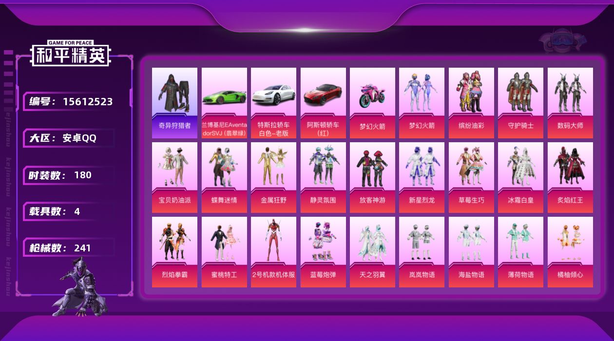 - PX_2102968- 苹果手Q-15王牌印记-6粉装-9特效枪-1载具-88027热力值-194套装-266枪皮-1卓越印记-0传奇印记 【6粉装】,梦幻火箭,天使彩虹糖,幻影飞狐,筑梦精灵,烈焰拳霸,金丰海韵 【9特效枪】AKM-炫紫旋律-4级 AKM-梦之光华-7级 SCAR-L-锦绣绵绵-5级 M416-五爪金龙-7级 GROZA-镜光银凌-5级 AUG-暖羊咩咩-5级 Kar98K-巳巳