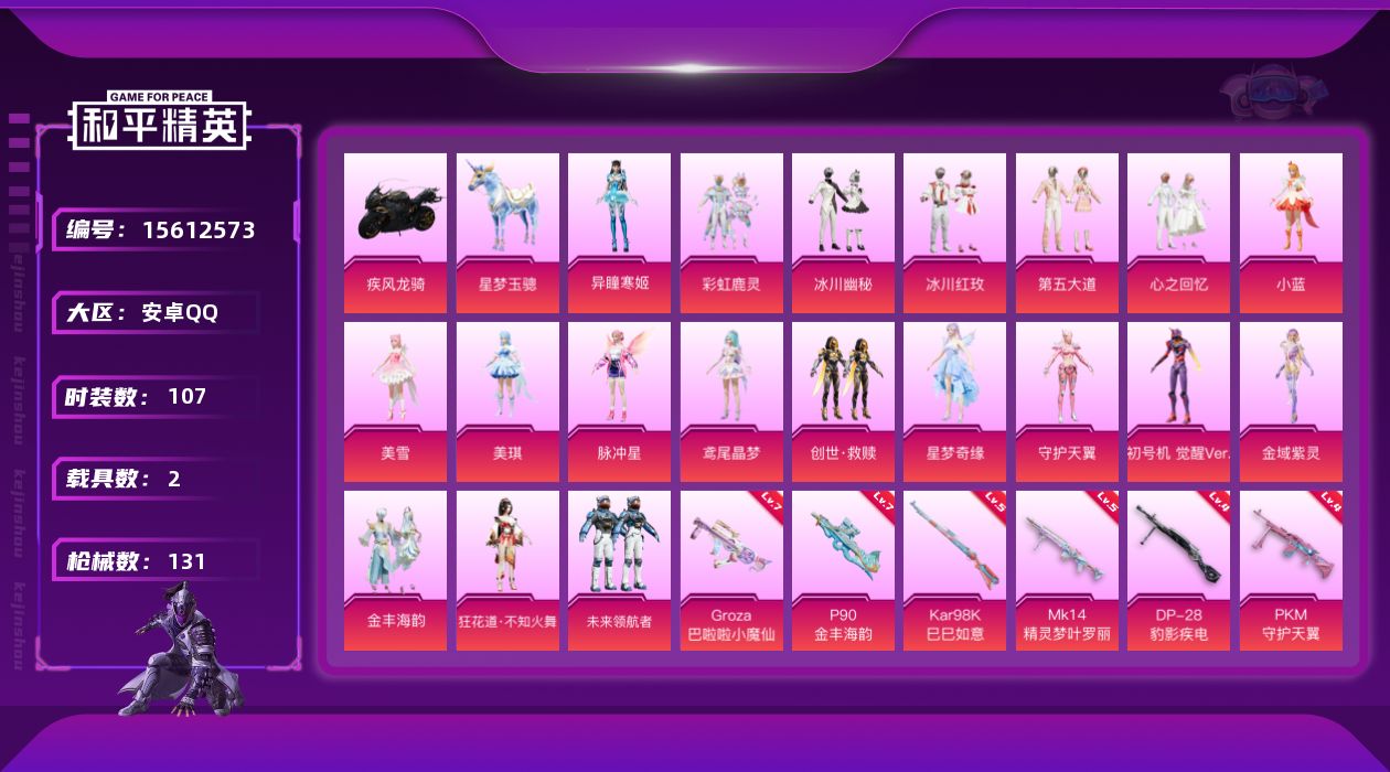 [15612573]安卓 手Q-觉醒螳螂-21粉装-12特效枪-2载具-5粉色飞行器-55051热力值-5王牌印记-107套装-131枪皮