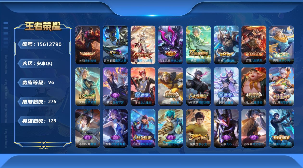 [15612790]可二次【店主推荐捡漏号!可直接换绑】安卓Q-V6-最强王者段位-127英雄-273皮肤-1典藏皮肤-5传说-77史诗-2星元 【英雄全皮】:孙权全皮,蒙恬全皮,戈娅全皮 【荣耀典藏】:关羽赤影疾锋 【传说皮肤】:后羿神树通天,澜愿照九州拓,桑启鸣野蒿,吕布怒海麟威,宫本武藏地狱之眼 【限定皮肤】:姜子牙天穹之誓,狄仁杰阴阳师,赵云皇家上将,墨子神迹守卫,鲁班七号狮舞东方,高渐离死亡摇滚,高渐离玩趣恶龙,钟无艳王者之锤,钟无艳超时空战士,白起夜都怪侠,芈月幻夜卜梦,周瑜赤莲之焰,元歌无心,甄姬落雪兰心,马可波罗暗影游猎,狄仁杰魔术师,狄仁杰万华元夜,达摩星际陆战队,达摩沙漠行僧,项羽海滩派对,老夫子航海奇遇记,程咬金演武夺筹,王昭君午后时光,兰陵王金庭之子,孙悟空孙行者,后羿圣弓游侠,李元芳云中旅人,钟馗驱傩正仪,女娲朔望之晖,干将莫邪胡桃夹子,雅典娜黎明之约,太乙真人华丽摇滚,鬼谷子原初探秘者,鬼谷子五谷丰年,黄忠火炮绅士,苏烈千军破阵,百里玄策原初追逐者,梦奇顽趣,沈梦溪星空之诺,沈梦溪大漠名商,明世隐吟游魔法,裴擒虎李小龙,裴擒虎擒涛扼浪,狂铁电玩高手,米莱狄胡桃异想国,云中君纤云弄巧,猪八戒猪悟能,嫦娥暖冬兔眠,西施玲珑珍味,鲁班大师探海日志,桑启海盐诗旅,暃星界游侠,戈娅驭风魔法,阿古朵江河有灵,张良古海寻踪,蒙恬荣光圣徽,高渐离燃音魔法,妲己灵卜魔法,鬼谷子天穹祈灯,姬小满妄想食味,沈梦溪龙舞盛年,鲁班七号蔬乡物语,李元芳蔬乡物语,刘邦剑破天穹,程咬金群星魔术团,镜青焰无极,项羽苍威无极,周瑜熔金海岸 【赛季限定】:狄仁杰万华元夜,达摩沙漠行僧,程咬金演武夺筹,兰陵王金庭之子,张良古海寻踪,李元芳云中旅人,钟馗驱傩正仪,雅典娜黎明之约,鬼谷子原初探秘者,苏烈千军破阵,百里玄策原初追逐者,梦奇顽趣,沈梦溪大漠名商,裴擒虎擒涛扼浪,鲁班大师探海日志,桑启海盐诗旅,鬼谷子天穹祈灯,蒙恬荣光圣徽,刘邦剑破天穹,姜子牙天穹之誓 【战令限定】:墨子神迹守卫,鲁班七号狮舞东方,钟无艳超时空战士,白起夜都怪侠,芈月幻夜卜梦,周瑜赤莲之焰,甄姬落雪兰心,马可波罗暗影游猎,达摩星际陆战队,老夫子航海奇遇记,王昭君午后时光,后羿圣弓游侠,女娲朔望之晖,黄忠火炮绅士,沈梦溪星空之诺,明世隐吟游魔法,狂铁电玩高手,米莱狄胡桃异想国,嫦娥暖冬兔眠,西施玲珑珍味,暃星界游侠,戈娅驭风