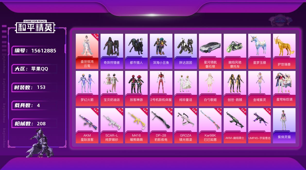 [15612885]2级云鸾!苹果 手Q-1神装-9粉装-8特效枪-4载具-11粉色飞行器-75615热力值-19王牌印记-153套装-208枪皮