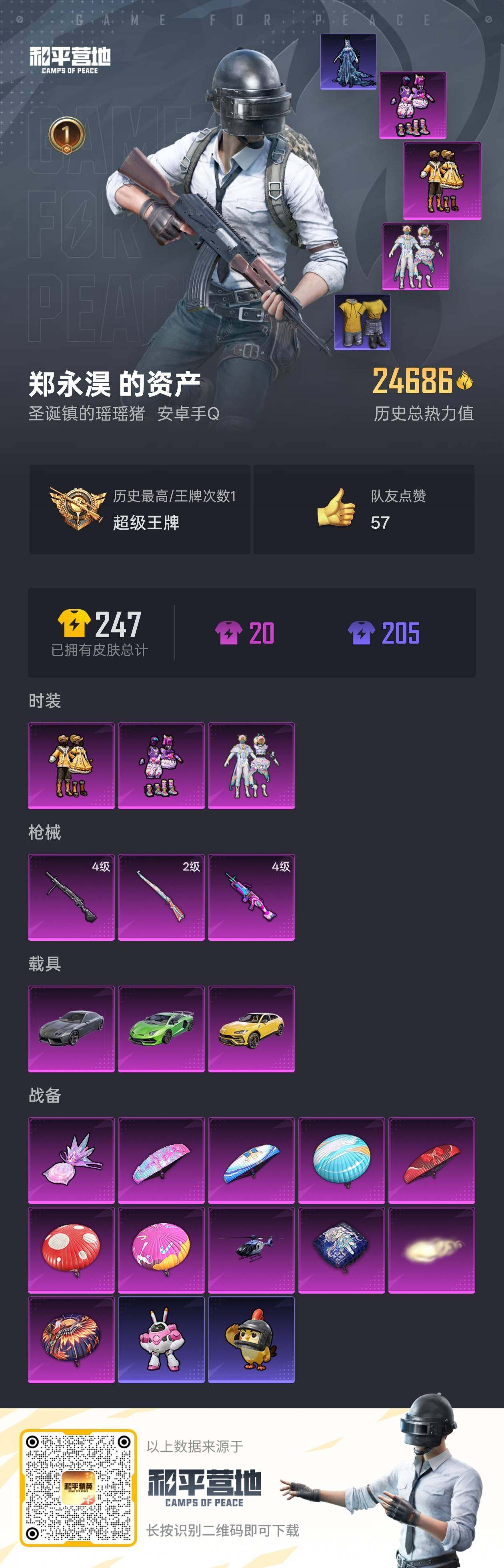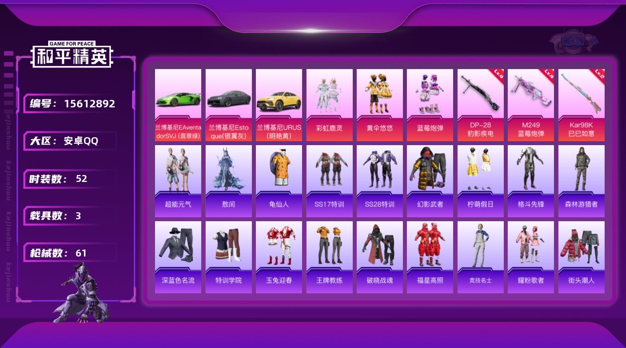 [15612892]【店主推荐捡漏号!可直接换绑】安卓 手Q-3粉装-3特效枪-3载具-1僚机-2粉色飞行器-24686热力值-1王牌印记-52套装-61枪皮【热门品类】:套装-龟仙人【粉色套装】:粉装-彩虹鹿灵,粉装-黄伞悠悠,粉装-蓝莓炮弹【粉色枪皮等级】:Kar98K-巳巳如意(二级),M249-蓝莓炮弹(四级),DP-28-豹影疾电(四级)【粉色载具】:兰博基尼Aventador SVJ(翡翠绿),兰博基尼Estoque(银翼灰),兰博基尼URUS(明艳黄),空客H135-蔚蓝之翼【粉色枪皮】:Kar98K-巳巳如意,M249-蓝莓炮弹,DP-28-豹影疾电【粉色飞行器】:齐天大圣飞行器