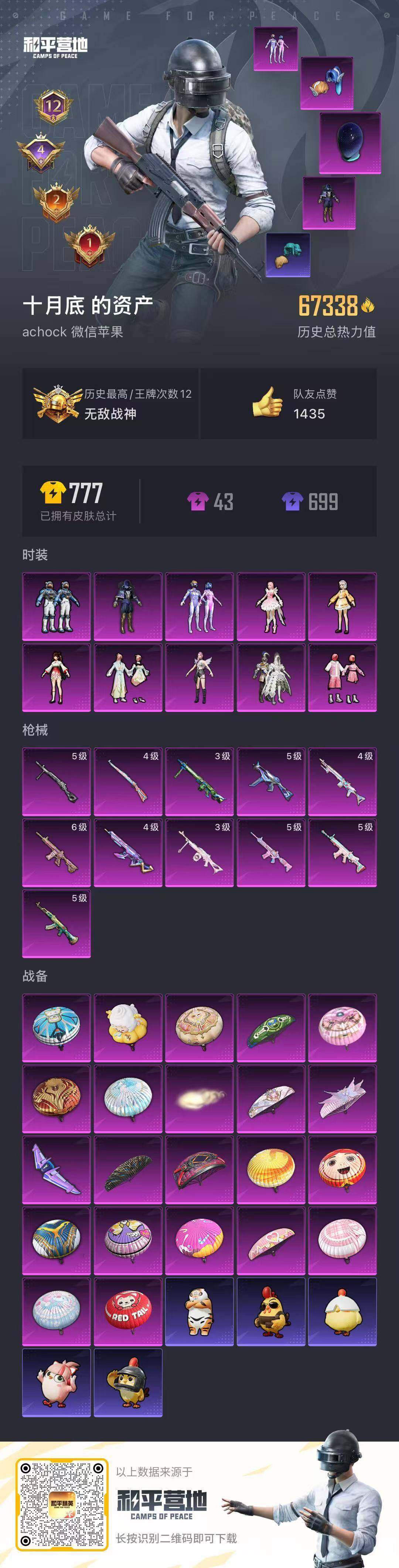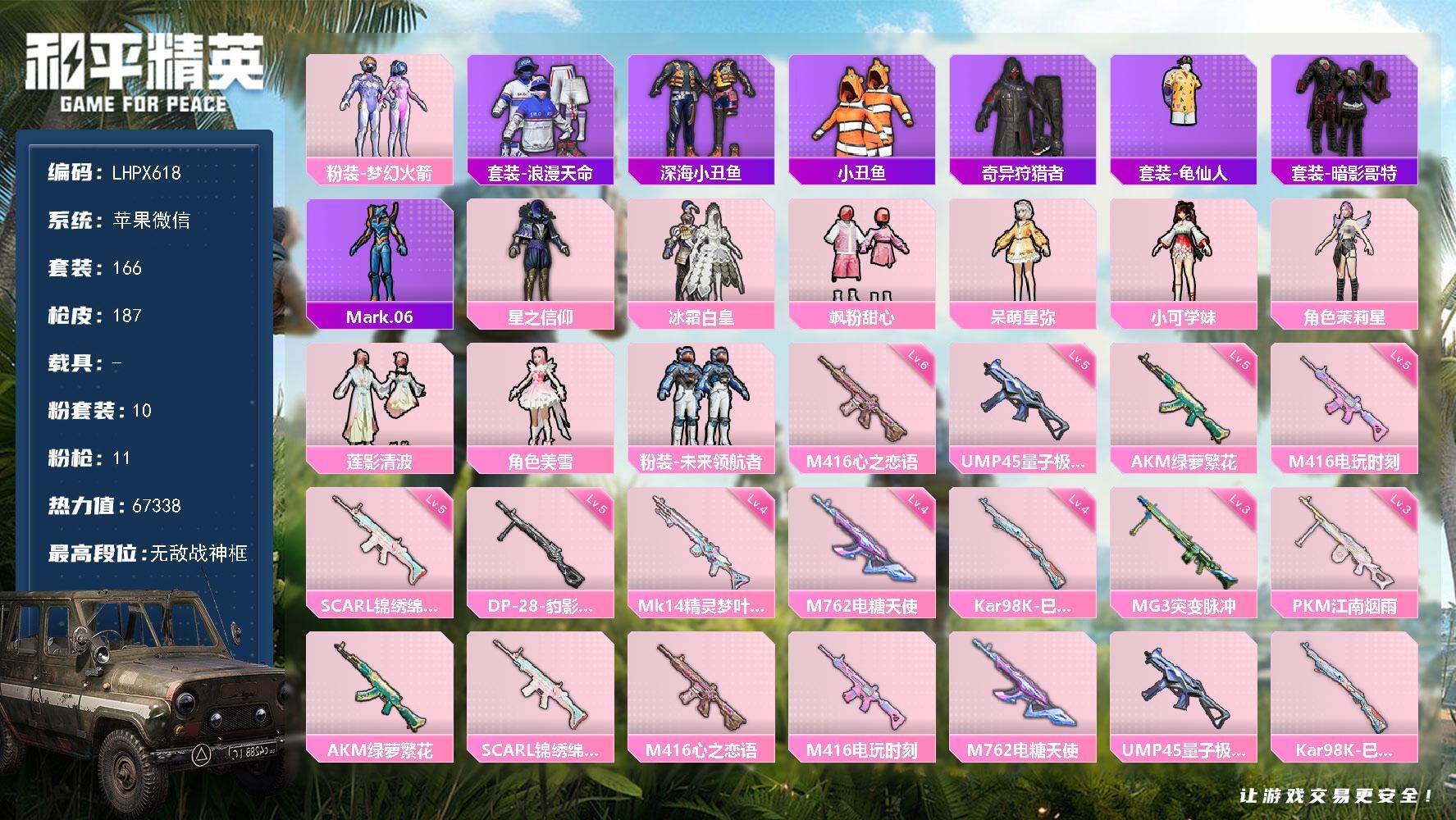 [15612934]【特价出售/店主推荐】苹果 微信-无敌战神框-10粉装-11特效枪-0载具-2粉色飞行器-67338热力值-12王牌印记-166套装-187枪皮
