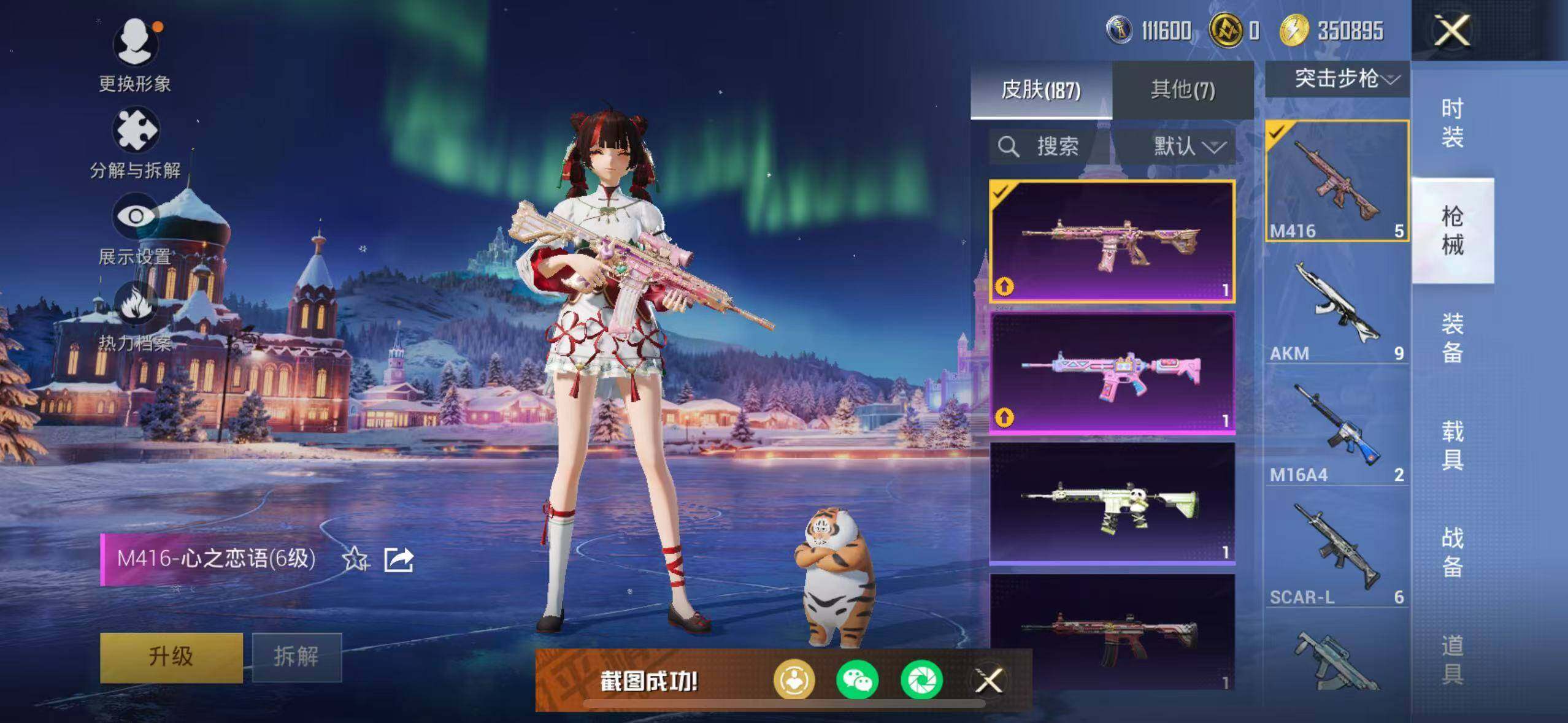 AKM-绿萝繁花,SCAR-L-锦绣绵绵,M416-心之恋语,M416-电玩时刻,M762-电糖天使,UMP45-量子极限,Kar98K-巳巳如意,Mk14-精灵梦叶罗丽,MG3-突变脉冲,PKM-江南烟雨