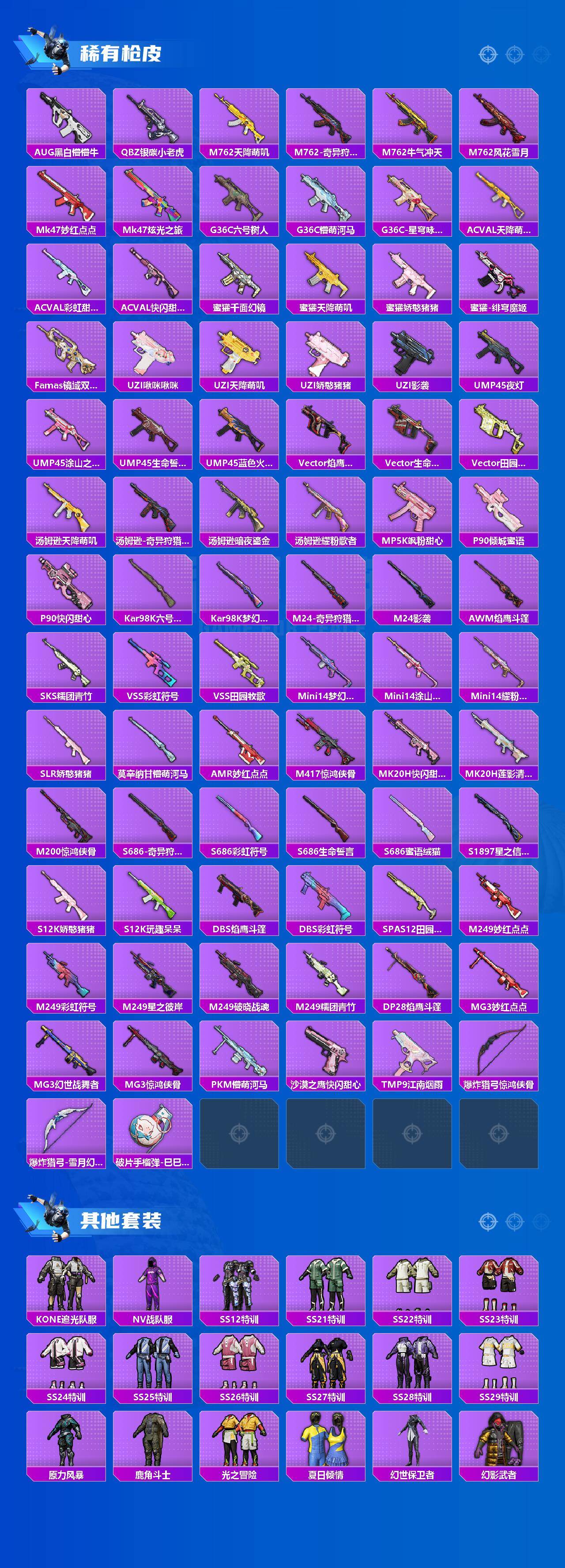 【稀有枪皮】:AKM-2P战斗服款,AKM-星之信仰,AKM-江南烟雨,AKM-生命誓言,AKM-破晓战魂,AKM-龙的传人,M16A4-蓝色火焰,SCAR-L-幽秘魅影,SCAR-L-炫彩节奏,SCAR-L-玉兔迎春,M416-糯团青竹,M416-红色方程式,M416-绯红前夜,GROZA-懵萌河马,GROZA-田园牧歌,AUG-天降萌叽,AUG-海螺星光,AUG-闲梦青缨,