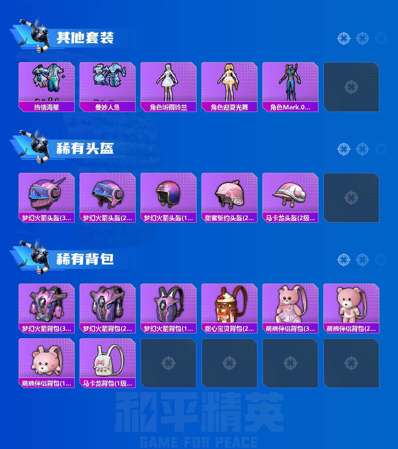 - [12578665]苹果 手Q-1粉装-1特效枪-0载具-0粉色飞行器-15731热力值-4王牌印记-53套装-56枪皮 【热门品类】:套装-龟仙人,角色-Mark.06 【粉色套装】:粉装-天使彩虹糖 【粉色枪皮等级】:PKM-江南烟雨(六级) 【粉色枪皮】:PKM-江南烟雨 【粉色降落伞】:百万伏特降落伞,江南烟雨降落伞,初号机 觉醒Ver.降落伞 【稀有套装】:套装-龟仙人 【稀有枪皮】:AKM-破晓战魂,AKM-龙的传人,SCAR-L-玉兔迎春,SCAR-L-红色方程式,M416-暗夜行者,M416-蓝色火焰,GROZA-田园牧歌,AUG-耀粉歌者,AC-VAL-天降萌叽,蜜獾-天降萌叽,蜜獾-娇憨猪猪,UZI-天降萌叽,UZI-娇憨猪猪,Vector-焰鹰斗篷,Vector-田园牧歌,Vector-创世·救赎,AWM-焰鹰斗篷,VSS-田园牧歌,Mini14-炫彩节奏,SLR-娇憨猪猪,S1897-炫彩节奏,S1897-百万伏特,S12K-娇憨猪猪,S12K-幻世战舞者,DBS-焰鹰斗篷,DBS-彩虹符号,SPAS-12-田园牧歌,M249-糯团青竹,DP-28-焰鹰斗篷,DP-28-旋转彩虹,TMP-9-江南烟雨,TMP-9-未来歌姬 【其他套装】:套装-SS19特训,套装-SS20特训,套装-SS21特训,套装-SS22特训,套装-SS23特训,套装-SS24特训,套装-SS25特训,套装-SS26特训,套装-SS27特训,套装-SS28特训,套装-幻世战舞者,套装-战地督导,套装-格斗专家,套装-深蓝色名流,套装-灼焰舞者,套装-牛气满满,套装-特殊使命,套装-甜蜜熊情侣,套装-破晓战魂,套装-空岛之星,套装-竞技名士,套装-红色运动,套装-绯格组合,套装-缤纷果语,套装-蓝色运动,套装-长空猛禽,套装-魅力单车,套装-鹤鸣,套装-麻辣教官,套装-黄色伏地魔,套装-黑色伏地魔,套装-龙的传人,套装-龟仙人,套装-风暴特警,套装-雪山征服者,套装-竞技角斗士,套装-娇憨猪猪,套装-萌趣咩咩,套装-田园牧歌,套装-轻风白浪,套装-无暇誓言,套装-焰鹰斗篷,套装-幽夜迷踪,套装-幻羽潜行,角色-湖雨初晴,套装-纯真浪花,套装-热情海星,角色-Mark.06 【稀有头盔】:甜心宝贝头盔(2级) 【稀有背包】:甜心宝贝背包(1级) 【营地ID】:797598890