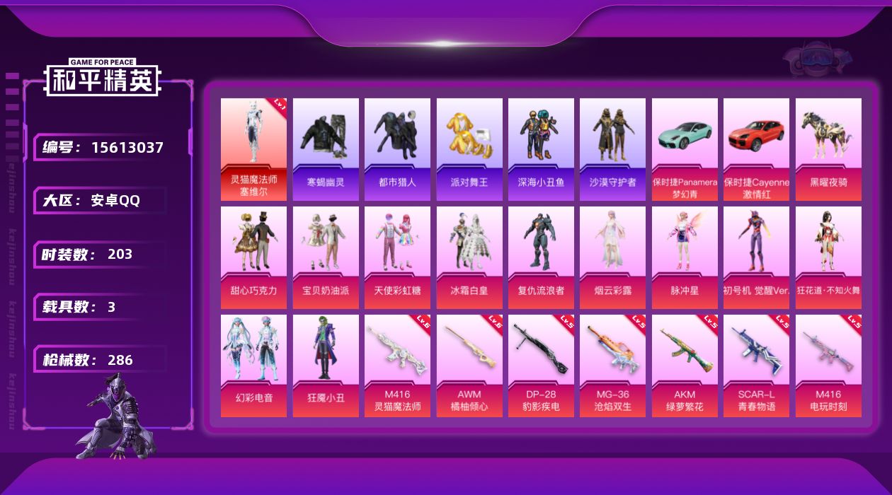 [15613037]可直接换绑-赤蝎都市金鞋哥特黑丝螳螂小丑三姐妹-1神装-11粉装-20特效枪-3载具-1僚机-12粉色飞行器-102934热力值-12王牌印记-203套装-286枪皮 【红色神装等级】:灵猫魔法师-塞维尔(一级) 【红色角色神装】:灵猫魔法师-塞维尔 【热门品类】:套装-寒蝎幽灵,套装-浪漫天命,套装-都市猎人,套装-派对舞王,套装-深海小丑鱼,角色-军刀雅典娜,套装-沙漠守护者,套装-AG战队服,套装-龟仙人,套装-潮萌小黄鸭,套装-暗影哥特,角色-8号机,角色-Mark.06,熔岩游骑兵连帽夹克 【粉色套装】:粉装-甜心巧克力,粉装-宝贝奶油派,粉装-天使彩虹糖,粉装-冰霜白皇,角色-复仇流浪者,角色-烟云彩露,角色-脉冲星,角色-初号机 觉醒Ver.,角色-狂花道·不知火舞,粉装-幻彩电音,角色-狂魇小丑 【粉色枪皮等级】:AKM-炫紫旋律(四级),AKM-绿萝繁花(五级),SCAR-L-青春物语(五级),M416-电玩时刻(五级),M416-墨龙九天(三级),M416-灵猫魔法师(六级),GROZA-精灵之光(三级),AUG-许七安(五级),M762-电糖天使(五级),M762-青锋波束(五级),UMP45-量子极限(五级),UMP45-宇宙意志(三级),AKS-74U-星穹咏叹调(四级),P90-沙丘之主(三级),Kar98K-巳巳如意(五级),AWM-橘柚倾心(六级),Mk14-精灵梦叶罗丽(五级),DP-28-豹影疾电(五级),MG-36-沧焰双生(五级),破片手榴弹-美味星星糖(五级) 【粉色载具】:保时捷Panamera(梦幻青),保时捷Cayenne(激情红),僚机-萌兔起飞,黑曜夜骑 【粉色枪皮】:AKM-炫紫旋律,AKM-绿萝繁花,SCAR-L-青春物语,M416-电玩时刻,M416-墨龙九天,M416-灵猫魔法师,GROZA-精灵之光,AUG-许七安,M762-电糖天使,M762-青锋波束,UMP45-量子极限,UMP45-宇宙意志,AKS-74U-星穹咏叹调,P90-沙丘之主,Kar98K-巳巳如意,AWM-橘柚倾心,Mk14-精灵梦叶罗丽,DP-28-豹影疾电,MG-36-沧焰双生,破片手榴弹-美味星星糖 【粉色飞行器】:酣梦熊熊飞行器,沙丘之主天马,镜域双华-灵镜之阶,龙翔九天飞行器,幻海精灵飞行器,深渊漩涡飞行器,曦光华影飞行器,