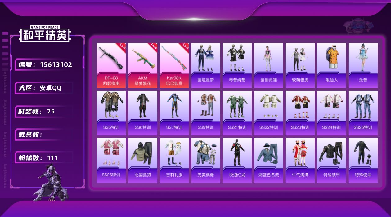 [15613102]【店主推荐捡漏号!可直接换绑】安卓 手Q-1粉装-3特效枪-0载具-1粉色飞行器-31403热力值-6王牌印记-75套装-111枪皮【热门品类】:套装-龟仙人【粉色套装】:角色-霁蓝缠春【粉色枪皮等级】:AKM-绿萝繁花(五级),Kar98K-巳巳如意(五级),DP-28-豹影疾电(五级)【粉色枪皮】:AKM-绿萝繁花,Kar98K-巳巳如意,DP-28-豹影疾电