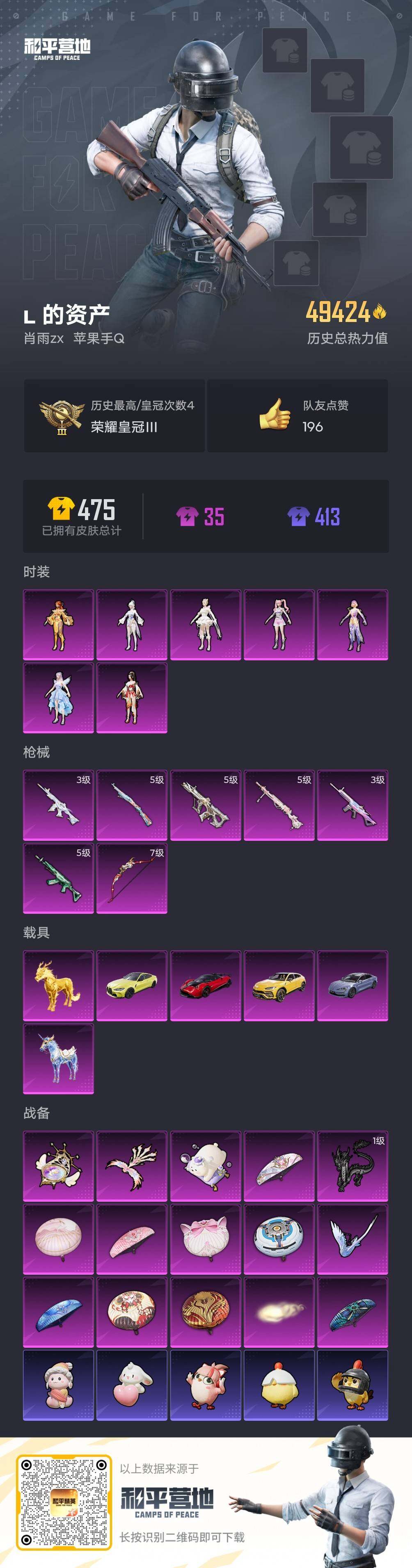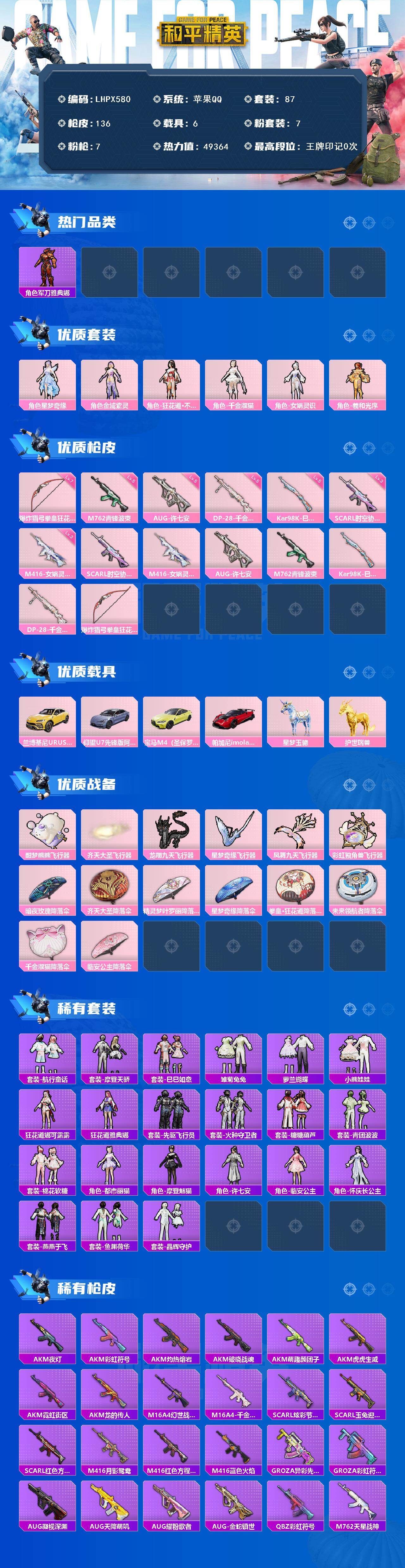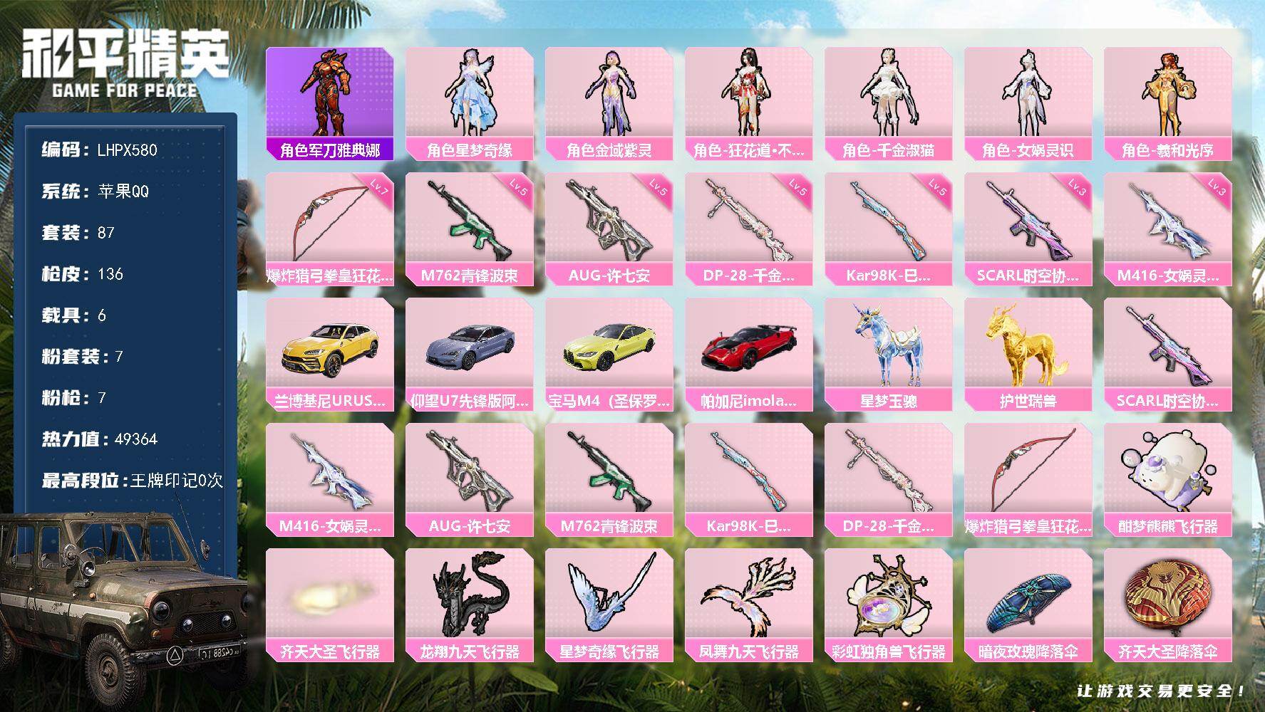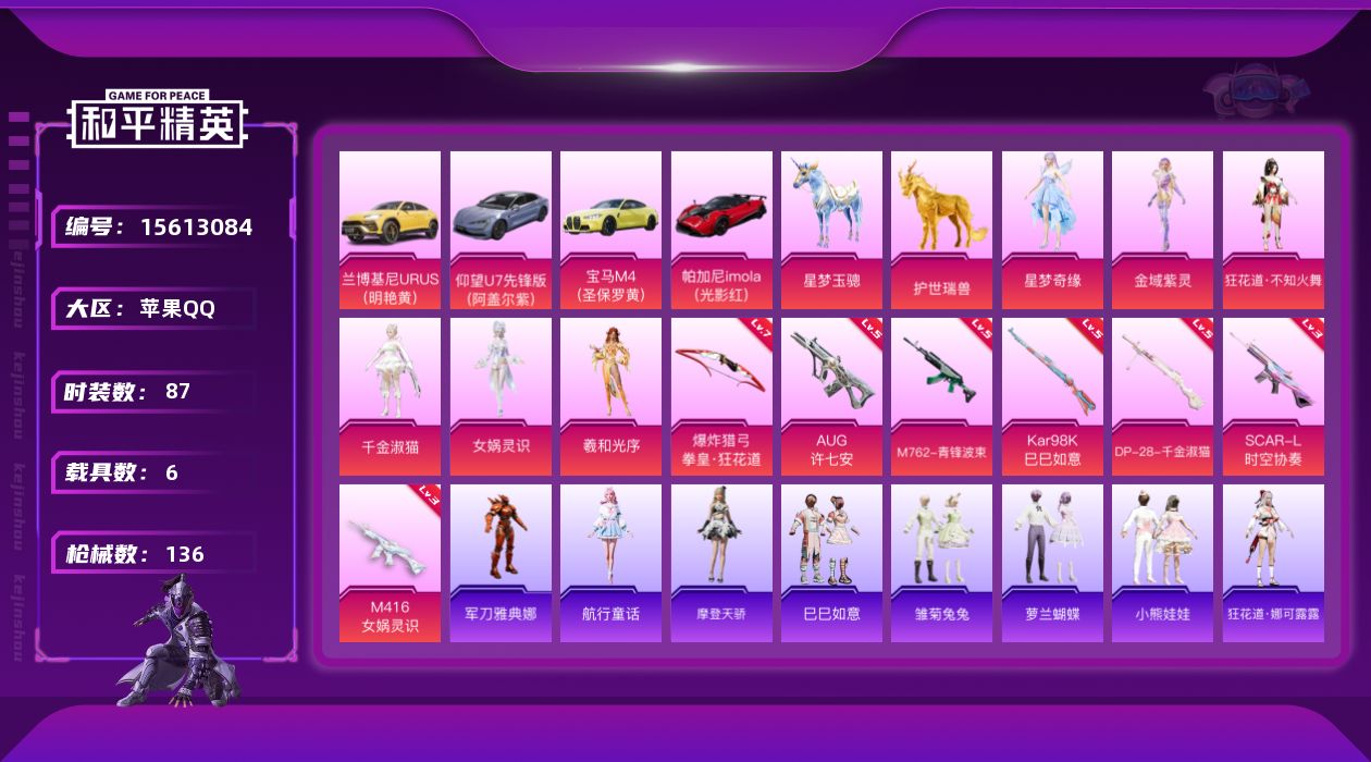 [15613084]【店主推荐捡漏号!可直接换绑】苹果 手Q-7粉装-7特效枪-6载具-6粉色飞行器-49364热力值-1王牌印记-87套装-136枪皮【热门品类】:角色-军刀雅典娜【粉色套装】:角色-星梦奇缘,角色-金域紫灵,角色-狂花道·不知火舞,角色-千金淑猫,角色-女娲灵识,角色-羲和光序【粉色枪皮等级】:SCAR-L-时空协奏(三级),M416-女娲灵识(三级),AUG-许七安(五级),M762-青锋波束(五级),Kar98K-巳巳如意(五级),DP-28-千金淑猫(五级),爆炸猎弓-拳皇·狂花道(七级)【粉色载具】:兰博基尼URUS(明艳黄),仰望U7(阿盖尔紫),宝马M4(圣保罗黄),帕加尼imola(光影红),星梦玉骢,护世瑞兽【粉色枪皮】:SCAR-L-时空协奏,M416-女娲灵识,AUG-许七安,M762-青锋波束,Kar98K-巳巳如意,DP-28-千金淑猫,爆炸猎弓-拳皇·狂花道【粉色飞行器】:酣梦熊熊飞行器,齐天大圣飞行器,龙翔九天飞行器,星梦奇缘飞行器,凤舞九天飞行器,彩虹独角兽飞行器