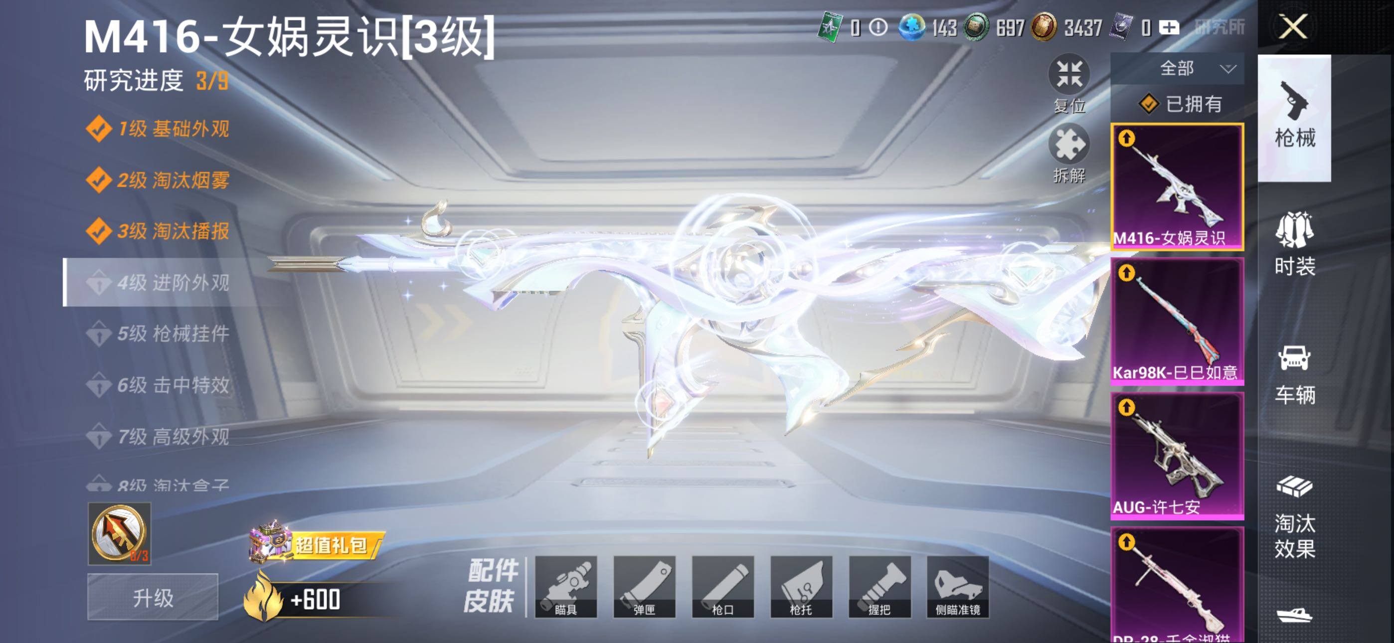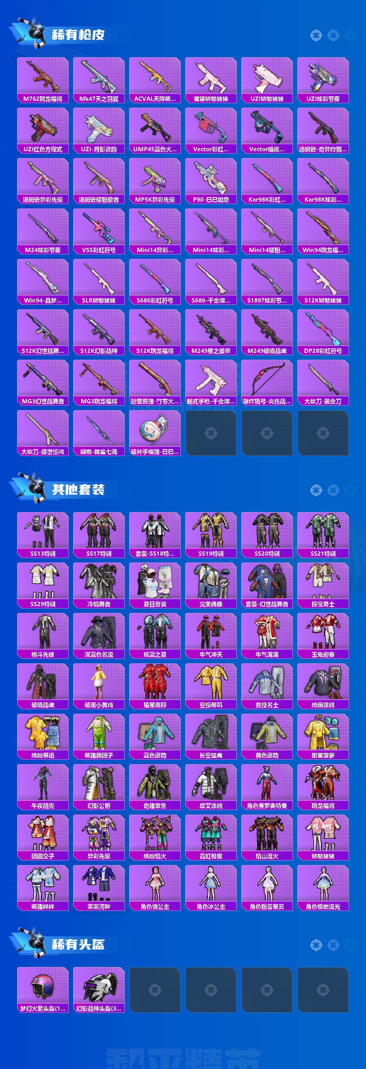 SCAR-L-时空协奏,M416-女娲灵识,AUG-许七安,M762-青锋波束,Kar98K-巳巳如意,DP-28-千金淑猫,爆炸猎弓-拳皇·狂花道