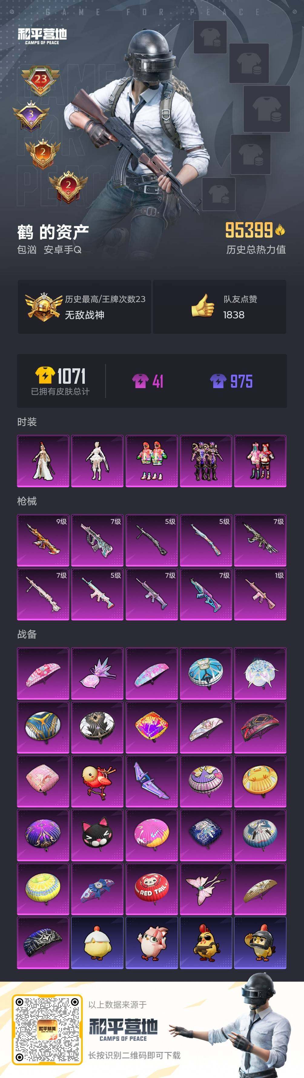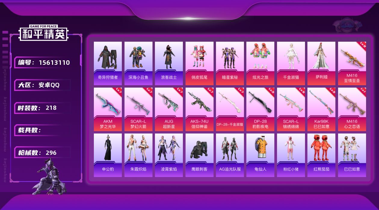 [15613110]【店主推荐捡漏号!可直接换绑】安卓 手Q-无敌战神框-5粉装-10特效枪-0载具-4粉色飞行器-95399热力值-23王牌印记-218套装-296枪皮【热门品类】:套装-深海小丑鱼,套装-奇异狩猎者,套装-浪客战士,套装-AG追光队服,套装-龟仙人,套装-粉红小猪,套装-红熊茄茄【粉色套装】:粉装-俏皮狐尾,粉装-暗星紫秘,粉装-炫光之旅,角色-千金淑猫,角色-萨利娅【粉色枪皮等级】:AKM-梦之光华(七级),SCAR-L-梦幻火箭(七级),SCAR-L-锦绣绵绵(五级),M416-心之恋语(一级),M416-至情至圣(九级),AUG-超新星(七级)AKS74U-信仰神谕(七级),Kar98K-巳巳如意(五级),DP-28-千金淑猫(七级),DP-28-豹影疾电(五级)【粉色枪皮】:AKM-梦之光华,SCAR-L-梦幻火箭,SCAR-L-锦绣绵绵,M416-心之恋语,M416-至情至圣,AUG-超新星,AKS-74U-信仰神谕,Kar98K-巳巳如意,DP-28-千金淑猫,DP-28-豹影疾电【粉色飞行器】:梦幻火箭飞行器,心之恋语飞行翼,歌者泠鸢飞行器