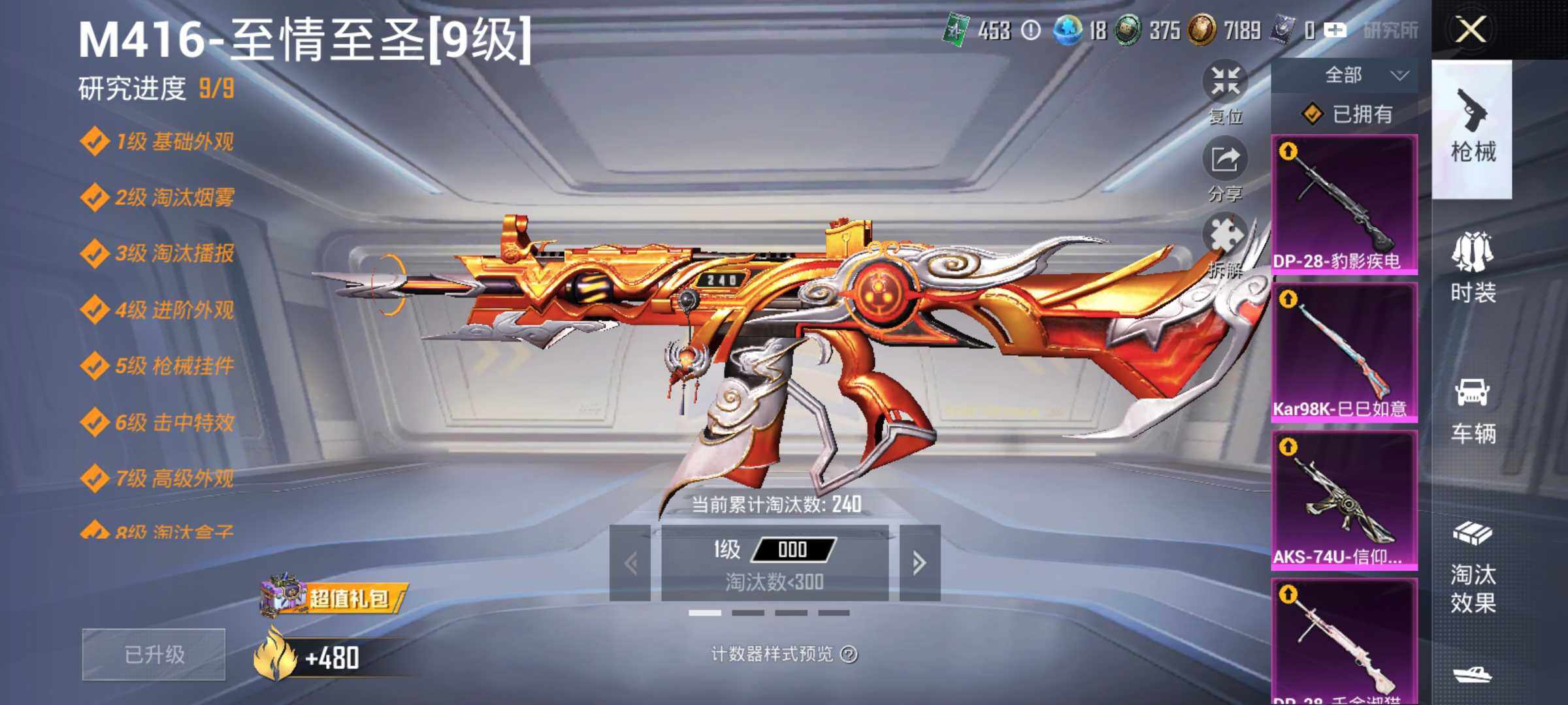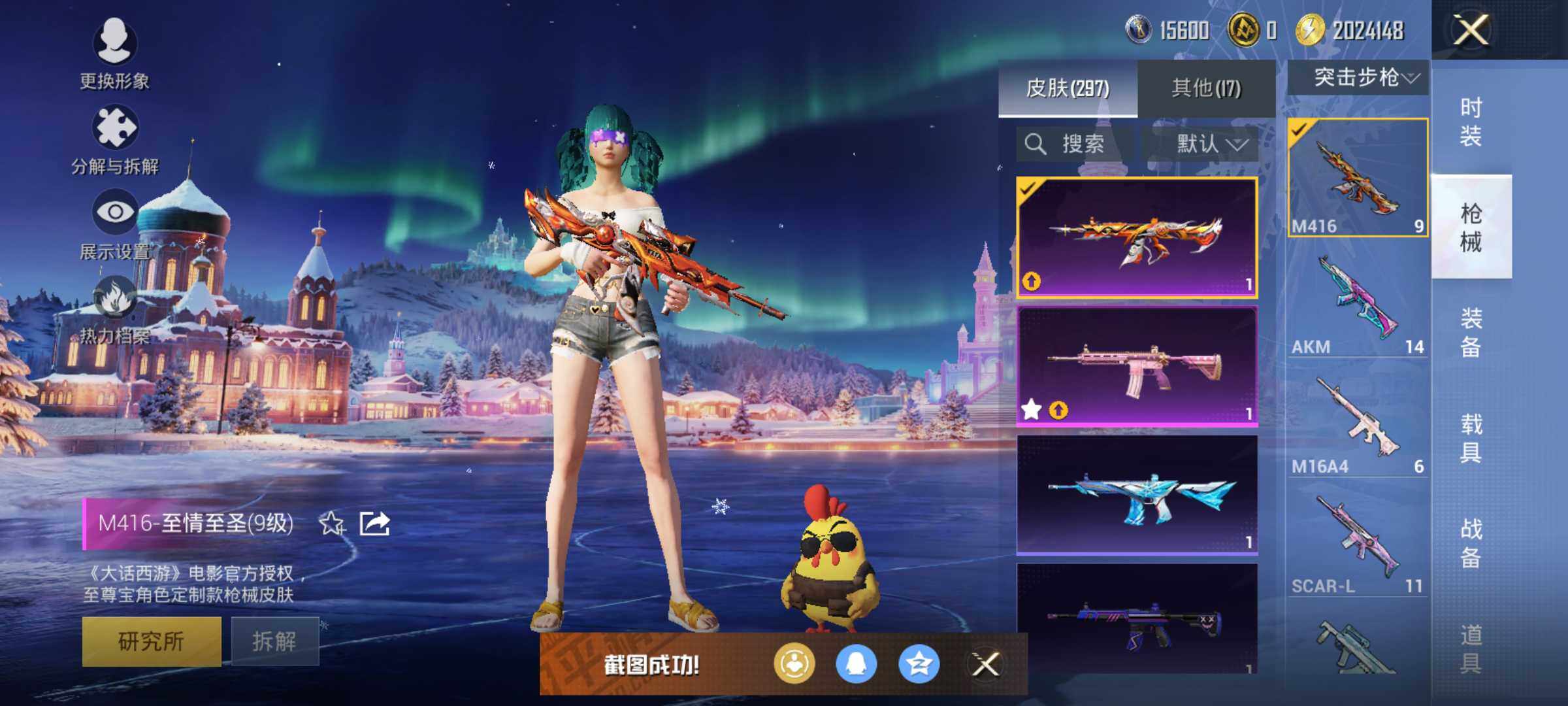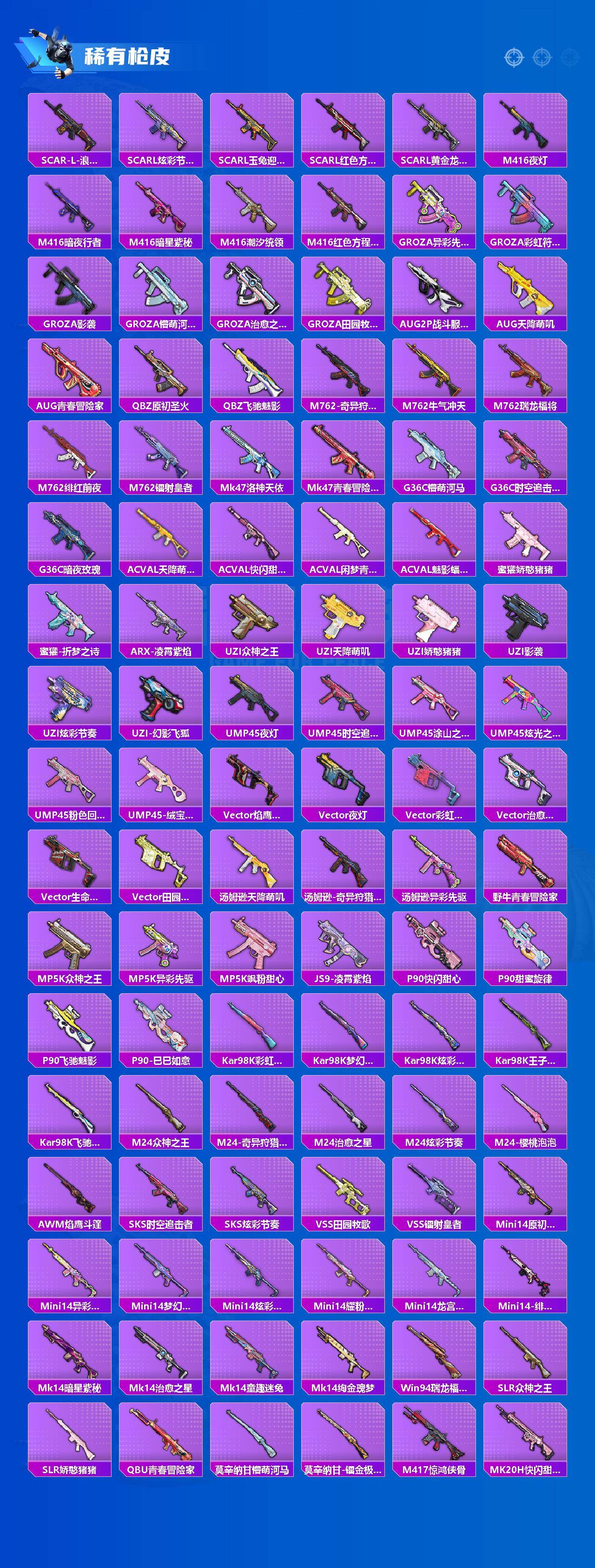 AKM-梦之光华,SCAR-L-梦幻火箭,SCAR-L-锦绣绵绵,M416-心之恋语,M416-至情至圣,AUG-超新星,AKS-74U-信仰神谕,Kar98K-巳巳如意,DP-28-千金淑猫