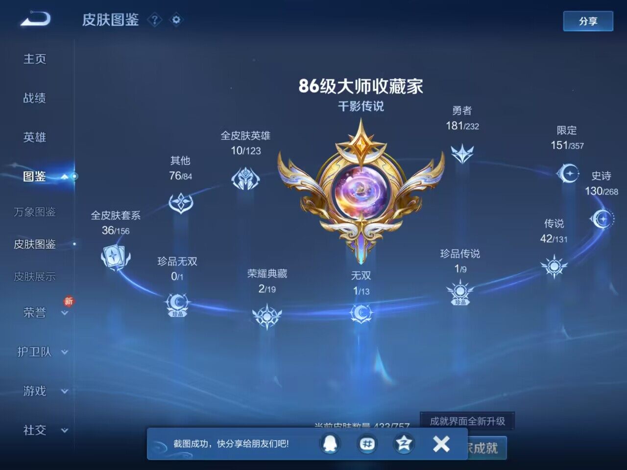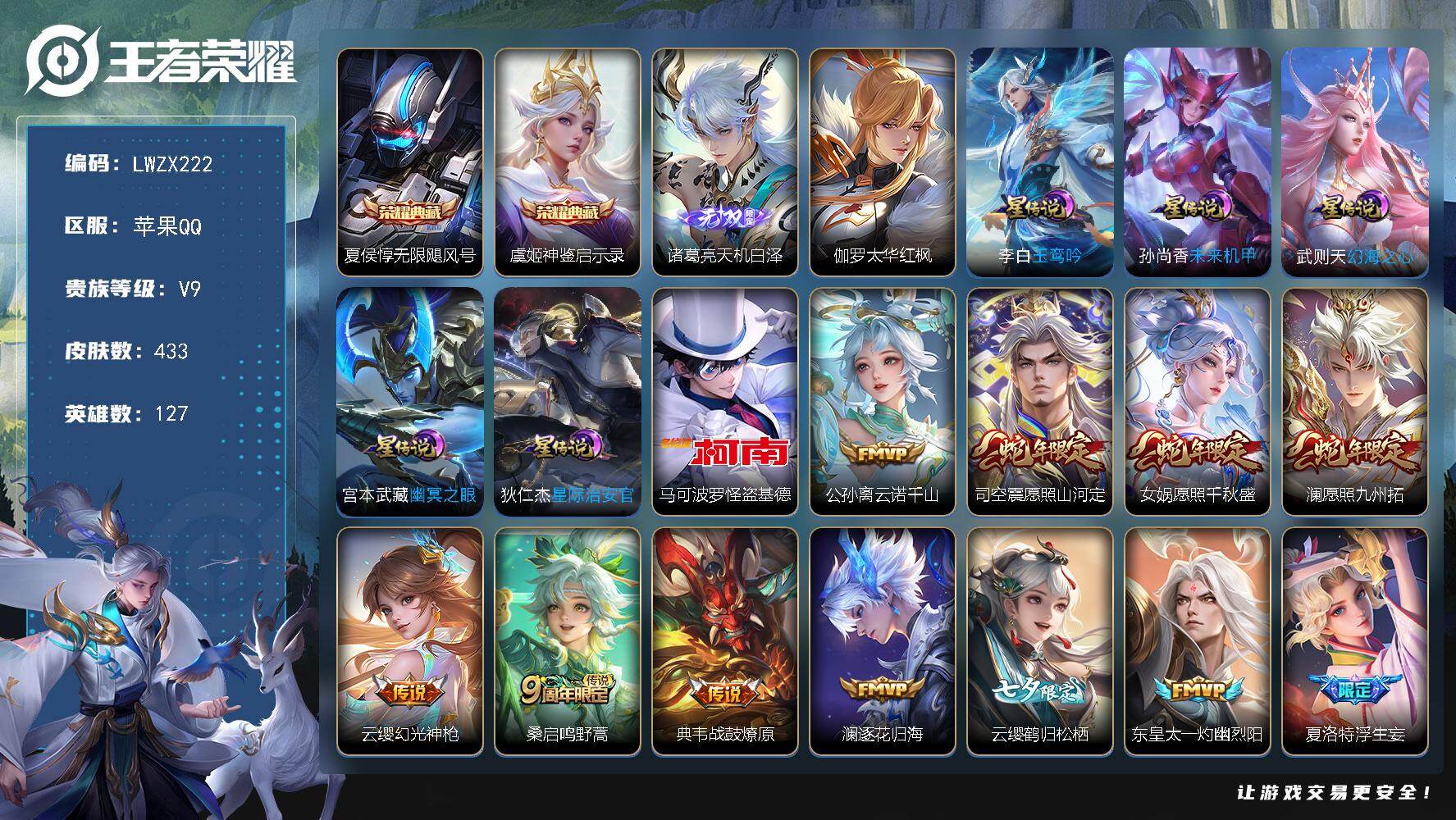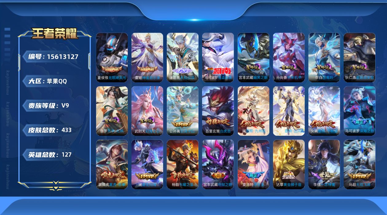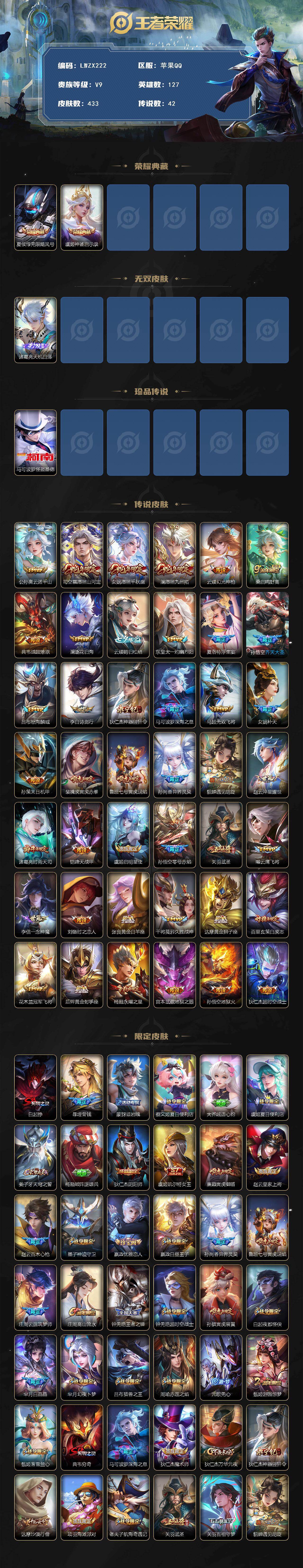 [15613127]可二次【特价出售/店主推荐】苹果Q-V9-最强王者段位-127英雄-433皮肤-2典藏皮肤-1无双-1珍品传说-42传说-130史诗-6星元