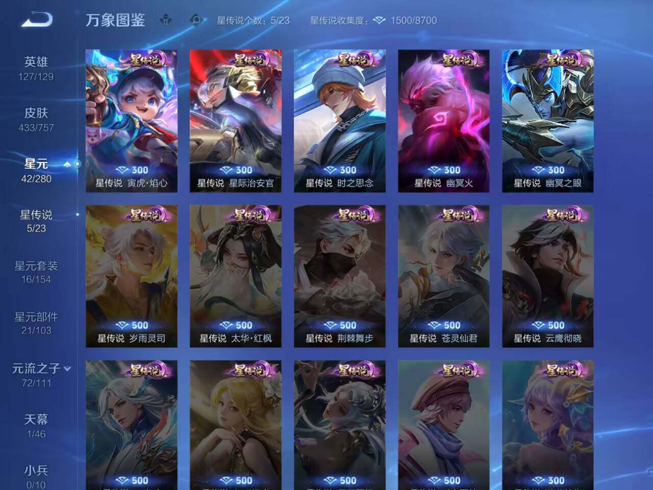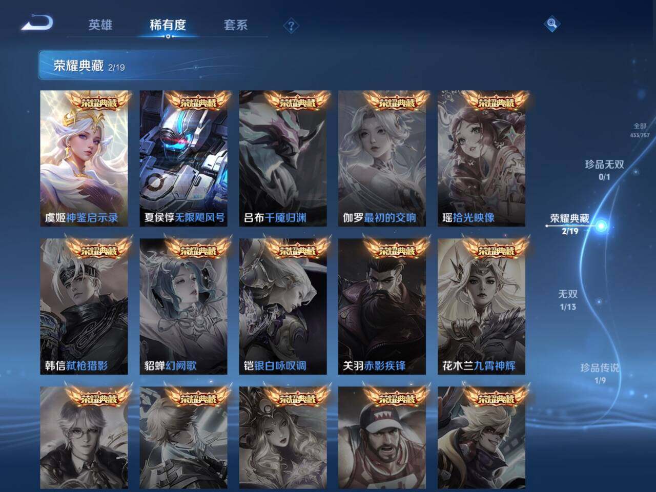 裴擒虎李小龙,上官婉儿梁祝,诸葛亮时雨天司,关羽武圣,张飞虎魄,马超神威,后羿辉光之辰,东皇太一逐梦之光,百里玄策白虎志,百里守约朱雀志,孙悟空大圣娶亲,露娜一生所爱,孙悟空至尊宝,干将莫邪冰霜恋舞曲,芈月白晶晶,孙悟空美猴王,庄周云端筑梦师,猪八戒猪悟能,廉颇寅虎·御盾,孙尚香异界灵契,孙悟空孙行者,镜匿光追影者,韩信傲雪梅枪,鲁班七号寅虎·瑞焰,孙膑寅虎·展翼,杨玉环寅虎·心曲,裴擒虎寅虎·赤拳,女娲补天,赵云百木心枪,马可波罗深海之息,李白诗剑行,桑启鸣野蒿,澜愿照·九州拓,司空震愿照·山河定,女娲愿照·千秋盛