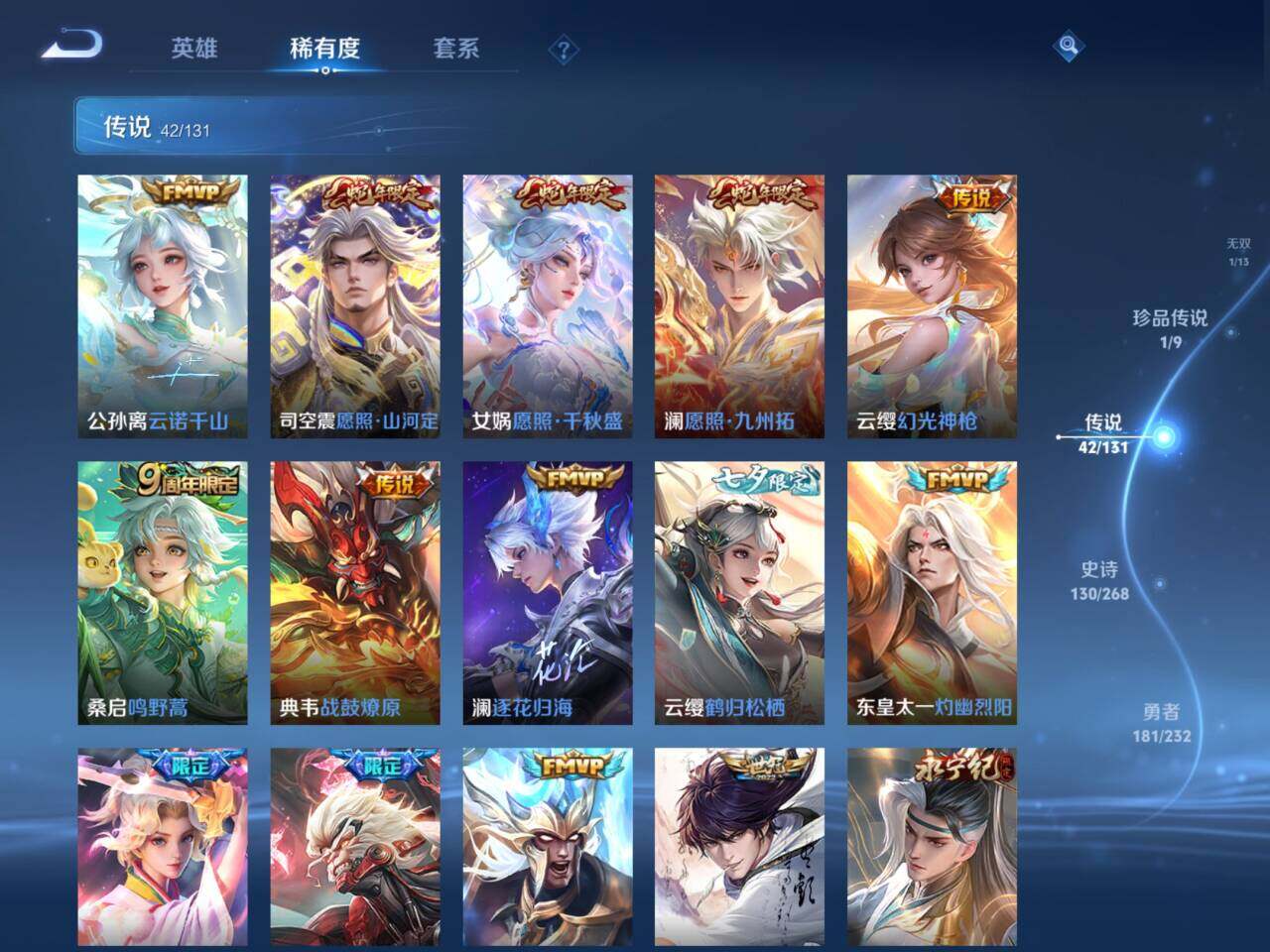 【传说皮肤】:公孙离云诺千山,司空震愿照山河定,女娲愿照千秋盛,澜愿照九州拓,云缨幻光神枪,桑启鸣野蒿,典韦战鼓燎原,澜逐花归海,云缨鹤归松栖,东皇太一灼幽烈阳,夏洛特浮生妄,孙悟空齐天大圣,吕布怒海麟威,李白诗剑行,狄仁杰神器狴犴令,马可波罗深海之息,马超无双飞将,女娲补天,孙策末日机甲,裴擒虎寅虎赤拳,鲁班七号寅虎瑞焰,孙尚香异界灵契,貂蝉遇见胡旋,赵云淬星耀世,诸葛亮时雨天司,铠绛天战甲,虞姬启明星使,孙悟空零号赤焰,关羽武圣,曜云鹰飞将,李信一念神魔,刘备时之恋人,张良黄金白羊座,干将莫邪久胜战神,达摩黄金狮子座,百里玄策白虎志,花木兰冠军飞将,后羿黄金射手座,杨戬永曜之星,宫本武藏地狱之眼,孙悟空地狱火,狄仁杰超时空战士