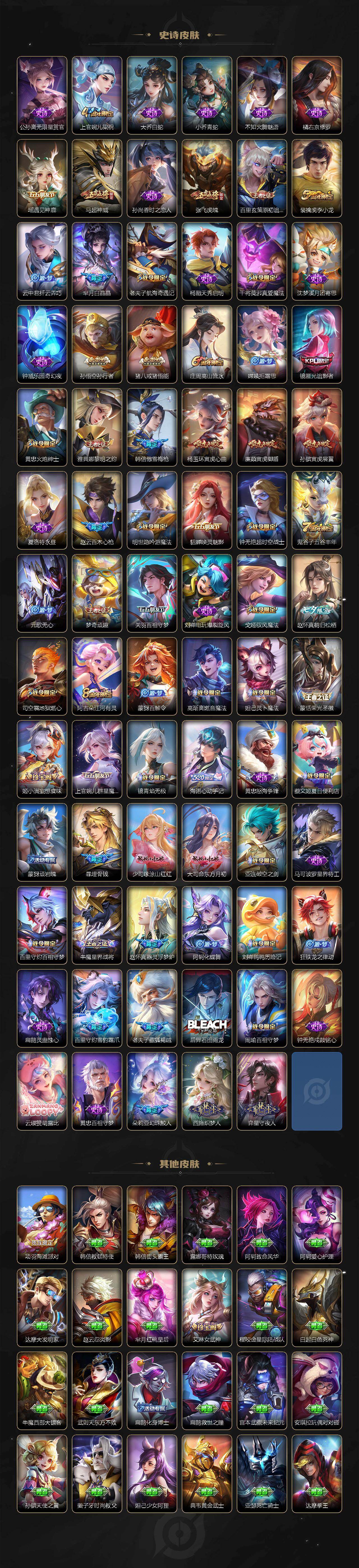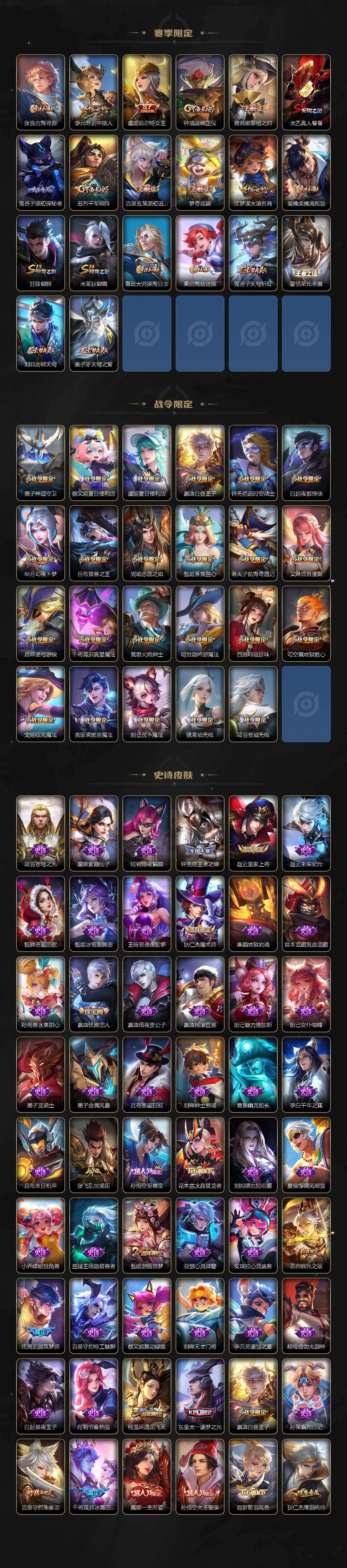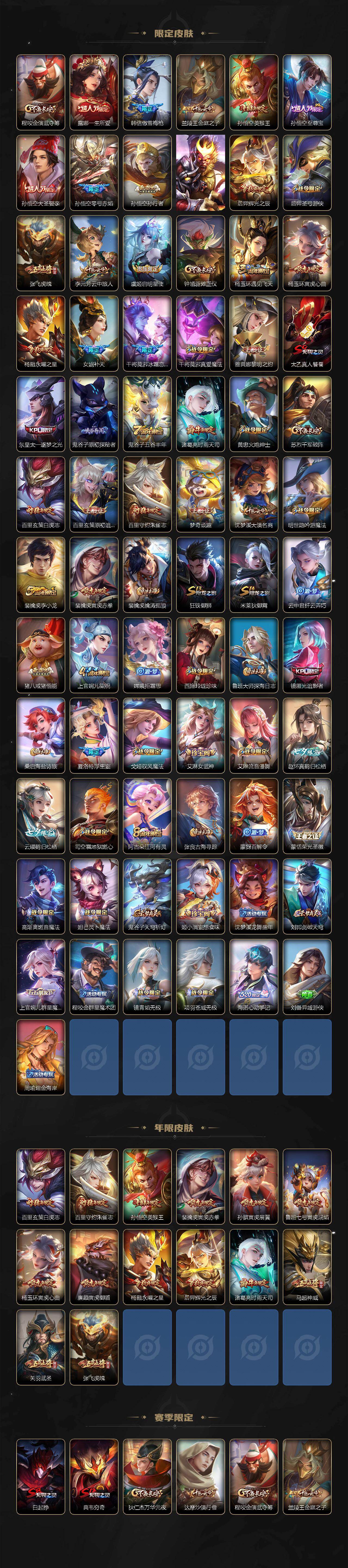 【限定皮肤】:白起狰,暃埋骨钱,蒙犽顽岩魄,蔡文姬夏日便利店,大乔绒语心约,虞姬夏日便利店,姜子牙天穹之誓,杨戬破阵退雄兵,狄仁杰阴阳师,虞姬凯尔特女王,廉颇寅虎御盾,赵云皇家上将,赵云百木心枪,墨子神迹守卫,嬴政优雅恋人,嬴政白昼王子,孙尚香异界灵契,鲁班七号寅虎瑞焰,庄周云端筑梦师,庄周高山流水,钟无艳王者之锤,钟无艳超时空战士,孙膑寅虎展翼,白起夜都怪侠,芈月白晶晶,芈月幻夜卜梦,吕布猎兽之王,周瑜赤莲之焰,元歌无心,甄姬游园惊梦,甄姬落雪兰心,典韦穷奇,马可波罗深海之息,狄仁杰魔术师,狄仁杰万华元夜,狄仁杰神器狴犴令,达摩沙漠行僧,项羽海滩派对,老夫子航海奇遇记,关羽武圣,关羽百相守梦,貂蝉遇见胡旋,程咬金演武夺筹,露娜一生所爱,韩信傲雪梅枪,兰陵王金庭之子,孙悟空美猴王,孙悟空至尊宝,孙悟空大圣娶亲,孙悟空零号赤焰,孙悟空孙行者,孙悟空齐天大圣,后羿辉光之辰,后羿圣弓游侠,张飞虎魄,李元芳云中旅人,虞姬启明星使,钟馗驱傩正仪,杨玉环遇见飞天,杨玉环寅虎心曲,杨戬永曜之星,女娲补天,干将莫邪冰霜恋舞曲,干将莫邪真爱魔法,雅典娜黎明之约,太乙真人饕餮,东皇太一逐