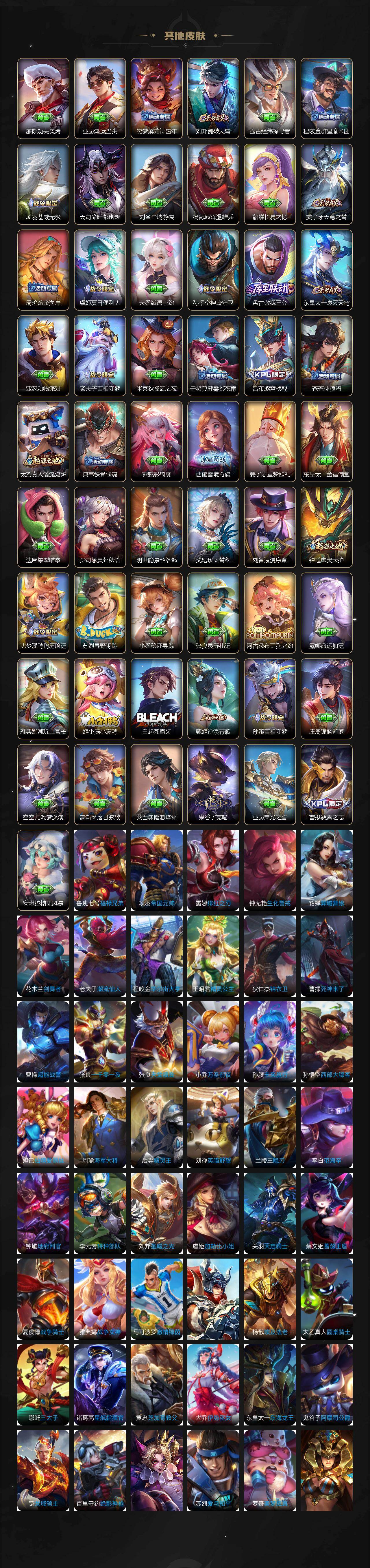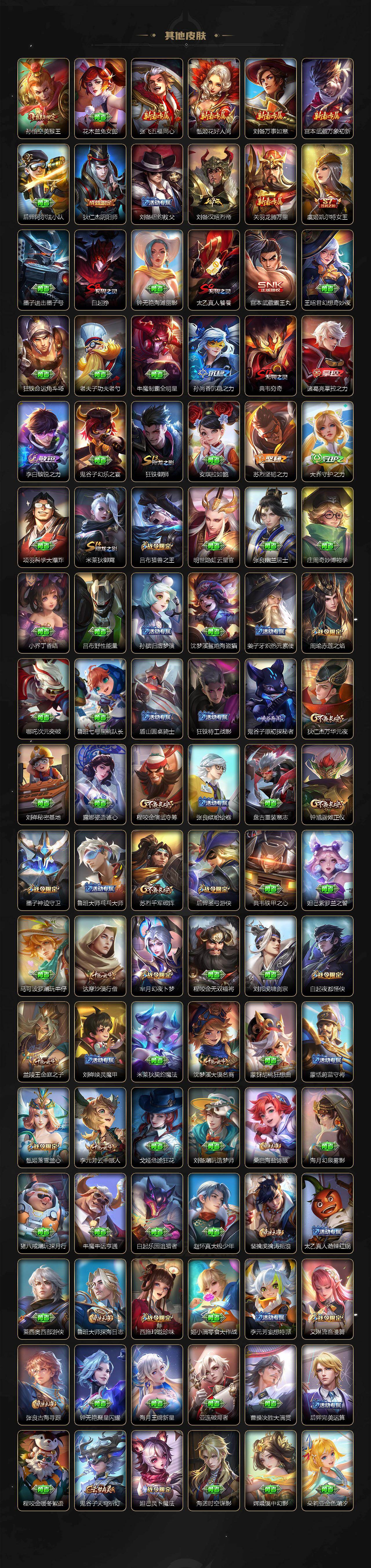 小乔青蛇,大乔白蛇,瑶遇见神鹿,伽罗箭羽风息,李元芳逐浪之夏,不知火舞魅语,公孙离无限星赏官,孙策猫狗日记,阿轲节奏热浪,露娜紫霞仙子,王昭君偶像歌手,项羽苍穹之光,孙尚香时之恋人,阿轲暗夜猫娘,吕布末日机甲,橘右京修罗,墨子龙骑士,嬴政摇滚巨星,刘禅绅士熊喵,刘禅天才门将,白起星夜王子,安琪拉心灵骇客,程咬金功夫厨神,刘邦德古拉伯爵,兰陵王暗隐猎兽者,曹操幽灵船长,宫本武藏鬼剑武藏,亚瑟心灵战警,钟馗乐园奇幻夜,杨戬天秀·启明,蔡文姬舞动绿茵,廉颇地狱岩魂,小乔缤纷独角兽,夏侯惇乘风破浪,花木兰水晶猎龙者,墨子金属风暴,百里玄策原初追逐者,吕布圣诞狂欢,貂蝉圣诞恋歌,百里守约特工魅影,嬴政暗夜贵公子,嫦娥拒霜思,雅典娜黎明之约,李白千年之狐,夏洛特永昼,貂蝉唤灵魅影,关羽百相守梦,刘禅电玩·爆裂旋风,赵怀真鹤归松栖,蒙犽百解令,高渐离燃音魔法,上官婉儿群星魔术团,海诺心动手记,赵怀真器灵·浮梦炉