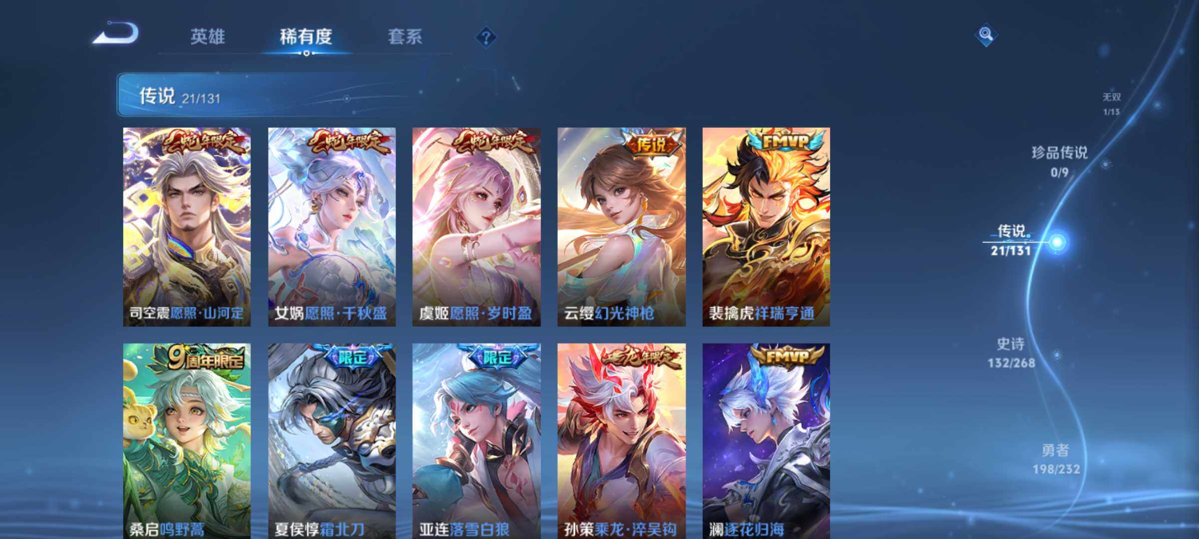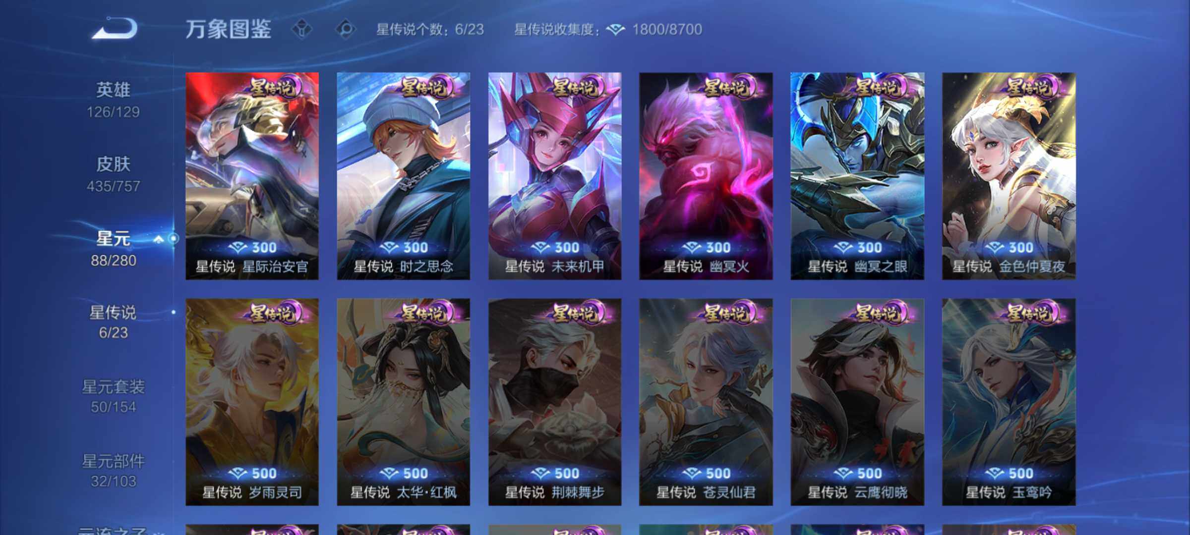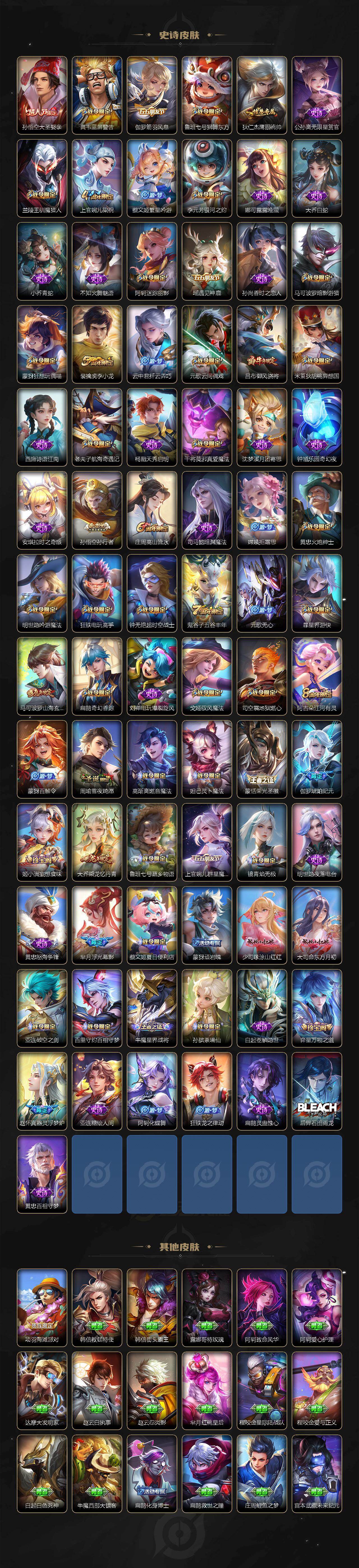 虞姬凯尔特女王,白起狰,太乙真人饕餮,曹操烛龙,芈月重明,典韦穷奇,狂铁御狮,米莱狄御霄,牛魔御旌,盾山御銮,夏侯惇朔风刀,明世隐疑决卦,老夫子醍醐杖,鬼谷子原初探秘者,狄仁杰万华元夜,程咬金演武夺筹,钟馗驱傩正仪,苏烈千军破阵,吕布猎兽之王,嬴政白昼王子,女娲朔望之晖,典韦蓝屏警告,钟馗神迹守卫,鲁班七号狮舞东方,沈梦溪星空之诺,李元芳银河之约,刘邦夺宝奇兵,马可波罗暗影游猎,蒙犽狂想玩偶喵,元歌云间偶戏,弈星混沌棋,达摩沙漠行僧,兰陵王金庭之子,沈梦溪大漠名商,李元芳云中旅人,桑启海盐诗旅,裴擒虎擒涛扼浪,鲁班大师探海日志,张良古海寻踪,项羽苍威无极,镜青焰无极