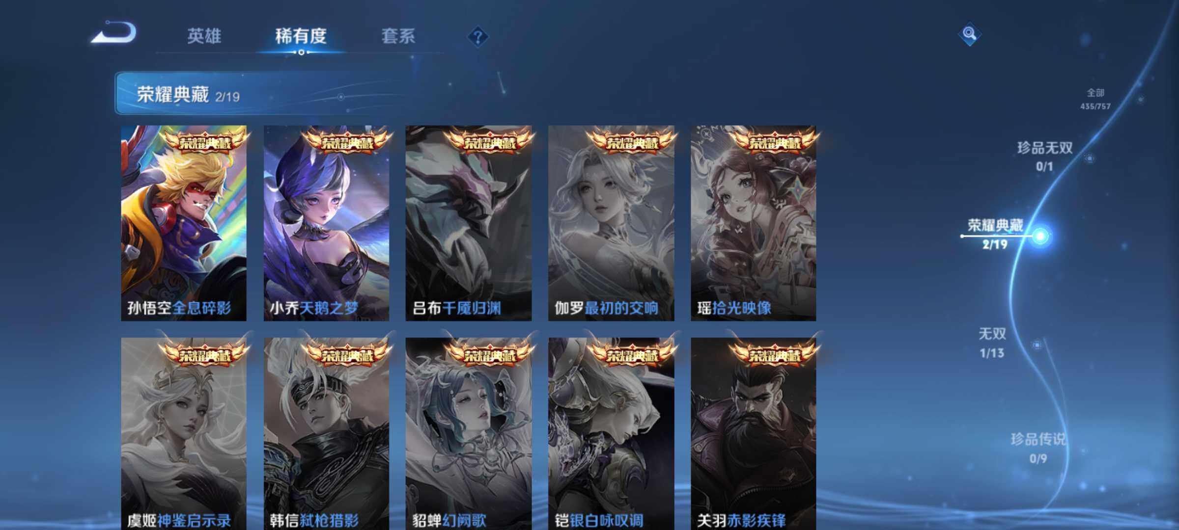 关羽冰锋战神,裴擒虎李小龙,上官婉儿梁祝,吕布御风骁将,诸葛亮时雨天司,东皇太一逐梦之光,孙悟空大圣娶亲,裴擒虎梅西,安琪拉魔法小厨娘,孙悟空孙行者,马可波罗山海·玄木吟,夏侯惇霜北刀,桑启鸣野蒿,虞姬愿照·岁时盈,司空震愿照·山河定,女娲愿照·千秋盛