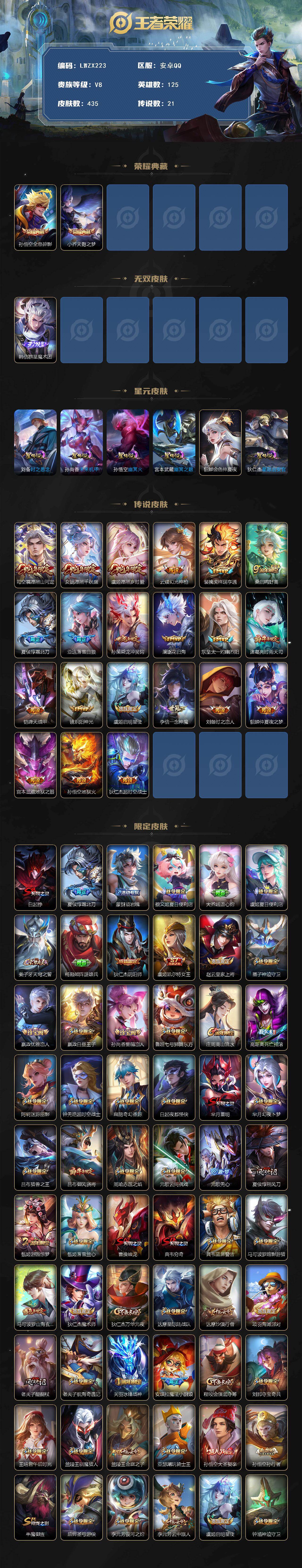 [15613133]可二次【特价出售/店主推荐】安卓Q-V8-最强王者段位-125英雄-435皮肤-2典藏皮肤-1无双-21传说-132史诗-6星元 【英雄全皮】:阿轲全皮,白起全皮,刘邦全皮,钟馗全皮,太乙真人全皮,东皇太一全皮,狂铁全皮,亚连全皮,司空震全皮,戈娅全皮,影全皮 【荣耀典藏】:孙悟空全息碎影,小乔天鹅之梦 【无双皮肤】:韩信群星魔术团 【传说皮肤】:司空震愿照山河定,女娲愿照千秋盛,虞姬愿照岁时盈,云缨幻光神枪,裴擒虎祥瑞亨通,桑启鸣野蒿,夏侯惇霜北刀,亚连落雪白狼,孙策乘龙淬吴钩,澜逐花归海,东皇太一灼幽烈阳,诸葛亮时雨天司,铠绛天战甲,镜炽阳神光,虞姬启明星使,李信一念神魔,刘备时之恋人,貂蝉仲夏夜之梦,宫本武藏地狱之眼,孙悟空地狱火,狄仁杰超时空战士 【限定皮肤】:白起狰,夏侯惇霜北刀,蒙犽顽岩魄,蔡文姬夏日便利店,大乔绒语心约,虞姬夏日便利店,姜子牙天穹之誓,杨戬破阵退雄兵,狄仁杰阴阳师,虞姬凯尔特女王,赵云皇家上将,墨子神迹守卫,嬴政优雅恋人,嬴政白昼王子,孙尚香蔷薇恋人,鲁班七号狮舞东方,庄周高山流水,高渐离死亡摇滚,阿轲迷踪丽影,钟无艳超时空战士,扁鹊奇幻香踪,白起夜都怪侠,芈月重明,芈月幻夜卜梦,吕布猎兽之王,吕布御风骁将,周瑜赤莲之焰,元歌云间偶戏,元歌无心,夏侯惇朔风刀,甄姬游园惊梦,甄姬落雪兰心,曹操烛龙,典韦穷奇,典韦蓝屏警告,马可波罗暗影游猎,马可波罗山海玄木吟,狄仁杰魔术师,狄仁杰万华元夜,达摩星际陆战队,达摩沙漠行僧,项羽海滩派对,老夫子醍醐杖,老夫子航海奇遇记,关羽冰锋战神,安琪拉魔法小厨娘,程咬金演武夺筹,刘邦夺宝奇兵,王昭君午后时光,兰陵王驯魔猎人,兰陵王金庭之子,亚瑟潮玩骑士王,孙悟空大圣娶亲,孙悟空孙行者,牛魔御旌,后羿圣弓游侠,李元芳银河之约,李元芳云中旅人,虞姬启明星使,钟馗神迹守卫,钟馗驱傩正仪,杨玉环遇见飞天,杨戬潮玩骑兵,女娲朔望之晖,干将莫邪真爱魔法,雅典娜单词大作战,蔡文姬繁星吟游,太乙真人饕餮,太乙真人华丽摇滚,东皇太一逐梦之光,鬼谷子原初探秘者,鬼谷子五谷丰年,诸葛亮时雨天司,黄忠火炮绅士,苏烈千军破阵,弈星混沌棋,沈梦溪星空之诺,沈梦溪大漠名商,明世隐疑决卦,明世隐吟游魔法,裴擒虎李小龙,裴擒虎擒涛扼浪,狂铁御狮,狂铁电玩高手,米莱狄御霄,米莱狄胡桃异想国,云中君纤云弄巧,盾山御銮,猪八戒西部大镖客,上官婉