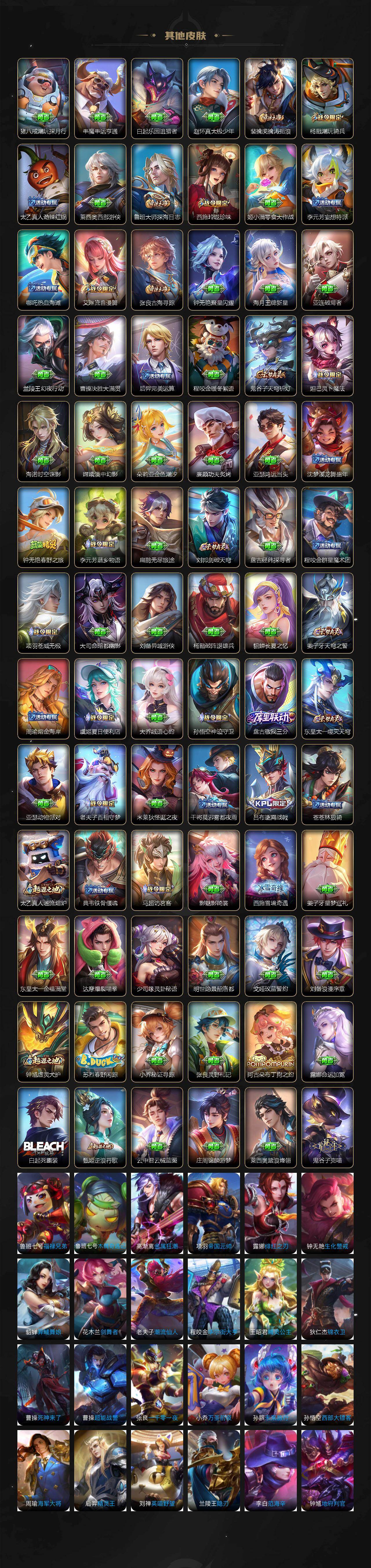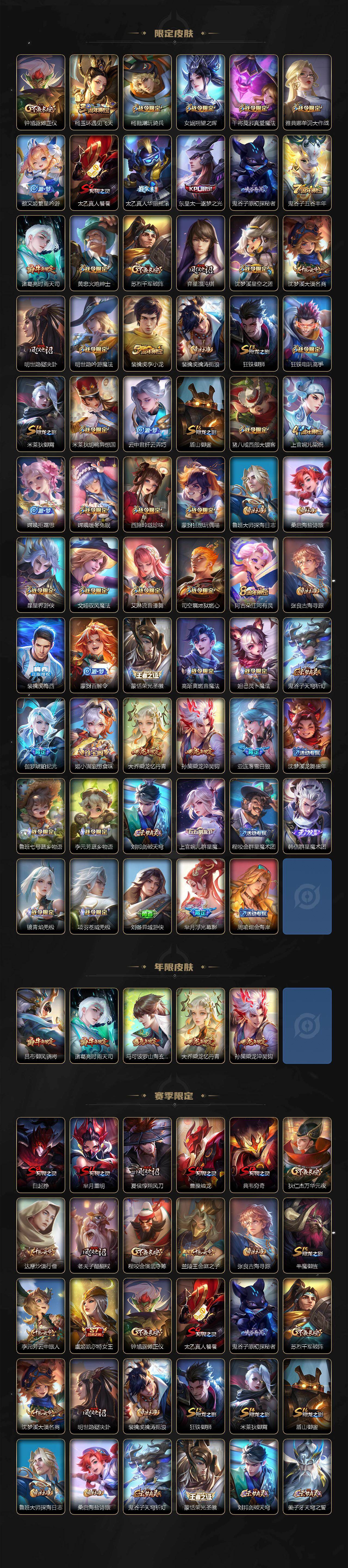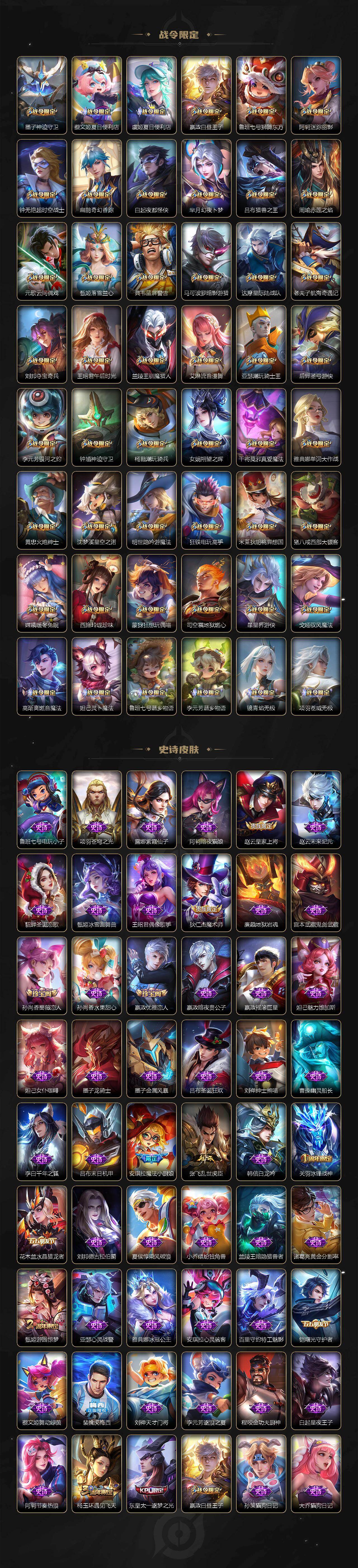 【限定皮肤】:白起狰,夏侯惇霜北刀,蒙犽顽岩魄,蔡文姬夏日便利店,大乔绒语心约,虞姬夏日便利店,姜子牙天穹之誓,杨戬破阵退雄兵,狄仁杰阴阳师,虞姬凯尔特女王,赵云皇家上将,墨子神迹守卫,嬴政优雅恋人,嬴政白昼王子,孙尚香蔷薇恋人,鲁班七号狮舞东方,庄周高山流水,高渐离死亡摇滚,阿轲迷踪丽影,钟无艳超时空战士,扁鹊奇幻香踪,白起夜都怪侠,芈月重明,芈月幻夜卜梦,吕布猎兽之王,吕布御风骁将,周瑜赤莲之焰,元歌云间偶戏,元歌无心,夏侯惇朔风刀,甄姬游园惊梦,甄姬落雪兰心,曹操烛龙,典韦穷奇,典韦蓝屏警告,马可波罗暗影游猎,马可波罗山海玄木吟,狄仁杰魔术师,狄仁杰万华元夜,达摩星际陆战队,达摩沙漠行僧,项羽海滩派对,老夫子醍醐杖,老夫子航海奇遇记,关羽冰锋战神,安琪拉魔法小厨娘,程咬金演武夺筹,刘邦夺宝奇兵,王昭君午后时光,兰陵王驯魔猎人,兰陵王金庭之子,亚瑟潮玩骑士王,孙悟空大圣娶亲,孙悟空孙行者,牛魔御旌,后羿圣弓游侠,李元芳银河之约,李元芳云中旅人,虞姬启明星使,钟馗神迹守卫,钟馗驱傩正仪,杨玉环遇见飞天,杨戬潮玩骑兵,女娲朔望之晖,干将莫邪真爱魔法,雅典娜单词大作战,蔡文姬繁星吟游,太乙真人饕餮,太乙真人华丽摇滚,东皇太一逐梦之光,鬼谷子原初探秘者,鬼谷子五谷丰年,诸葛亮时雨天司,黄忠火炮绅士,苏烈千军破阵,弈星混沌棋,沈梦溪星空之诺,沈梦溪大漠名商,明世隐疑决卦,明世隐吟游魔法,裴擒虎李小龙,裴擒虎擒涛扼浪,狂铁御狮,狂铁电玩高手,米莱狄御霄,米莱狄胡桃异想国,云中君纤云弄巧,盾山御銮,猪八戒西部大镖客,上官婉