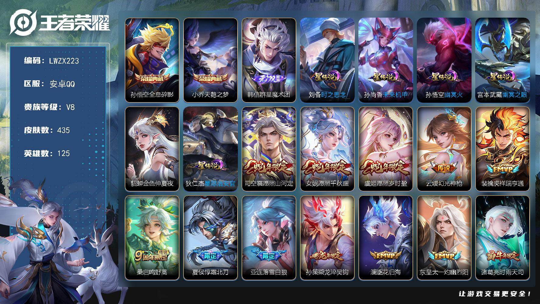 [15613133]可二次【特价出售/店主推荐】安卓Q-V8-最强王者段位-125英雄-435皮肤-2典藏皮肤-1无双-21传说-132史诗-6星元