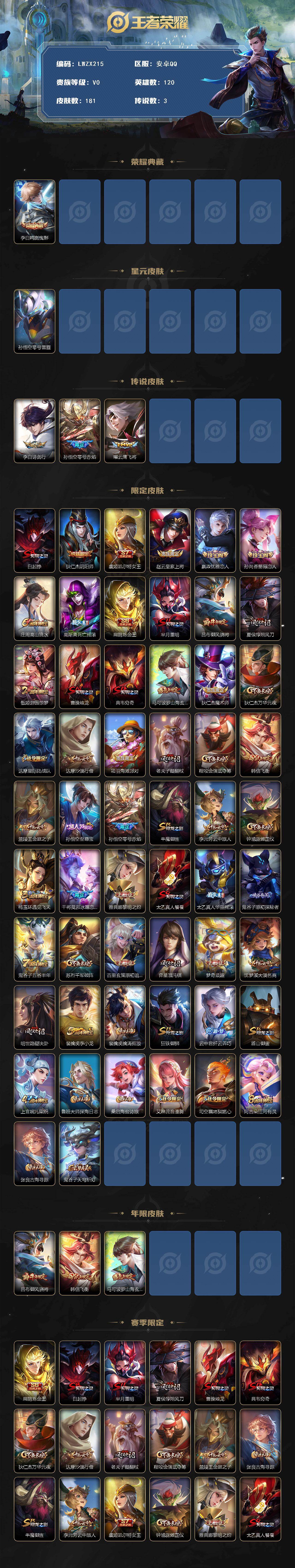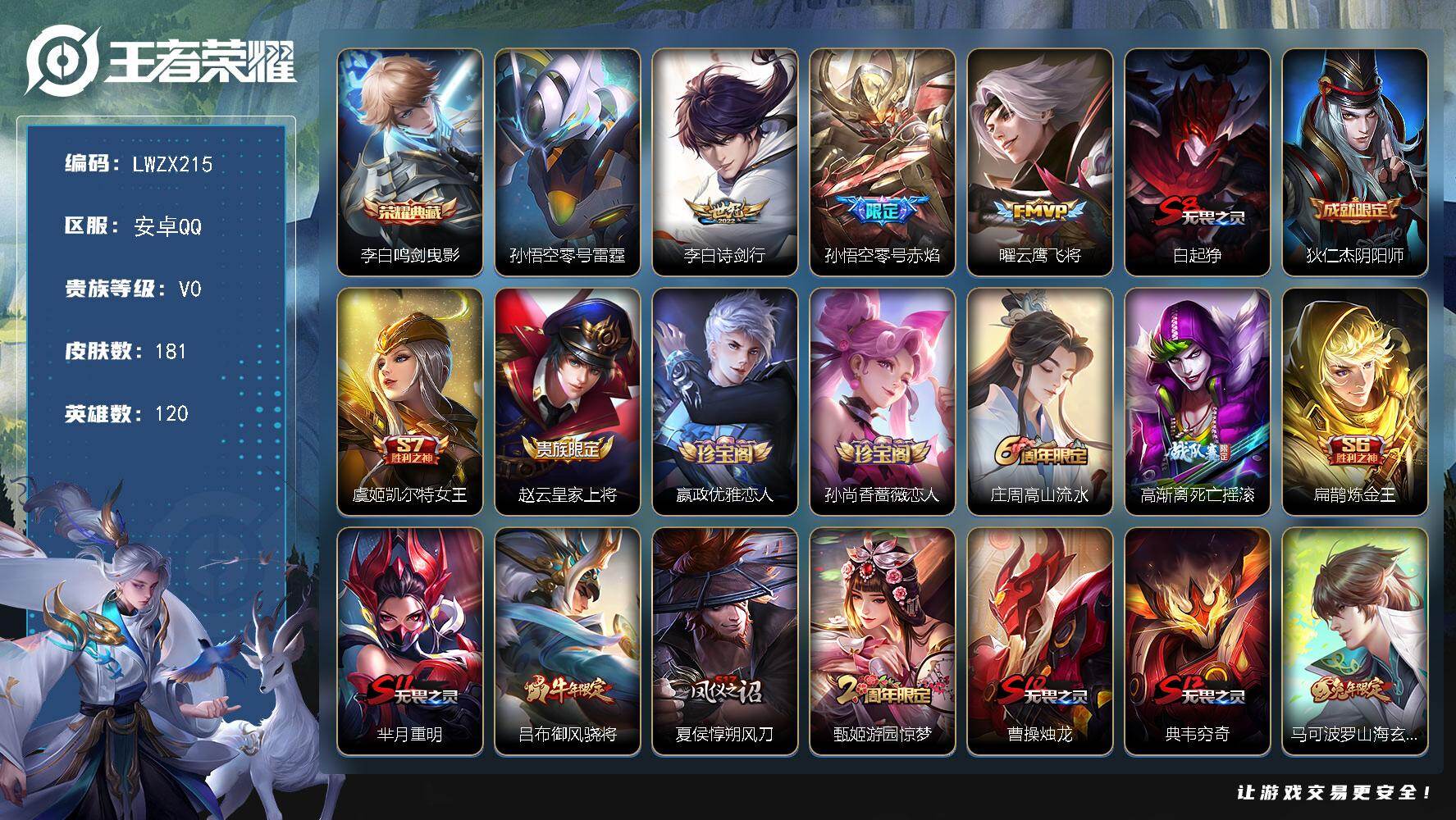 [15613197]【特价出售/店主推荐】安卓Q-V0-荣耀黄金II段位-120英雄-181皮肤-1典藏皮肤-3传说-49史诗-1星元 【荣耀典藏】:李白鸣剑曳影 【传说皮肤】:李白诗剑行,孙悟空零号赤焰,曜云鹰飞将 【限定皮肤】:白起狰,狄仁杰阴阳师,虞姬凯尔特女王,赵云皇家上将,嬴政优雅恋人,孙尚香蔷薇恋人,庄周高山流水,高渐离死亡摇滚,扁鹊炼金王,芈月重明,吕布御风骁将,夏侯惇朔风刀,甄姬游园惊梦,曹操烛龙,典韦穷奇,马可波罗山海玄木吟,狄仁杰魔术师,狄仁杰万华元夜,达摩星际陆战队,达摩沙漠行僧,项羽海滩派对,老夫子醍醐杖,程咬金演武夺筹,韩信飞衡,兰陵王金庭之子,孙悟空至尊宝,孙悟空零号赤焰,牛魔御旌,李元芳云中旅人,钟馗驱傩正仪,杨玉环遇见飞天,干将莫邪冰霜恋舞曲,雅典娜黎明之约,太乙真人饕餮,太乙真人华丽摇滚,鬼谷子原初探秘者,鬼谷子五谷丰年,苏烈千军破阵,百里玄策原初追逐者,弈星混沌棋,梦奇顽趣,沈梦溪大漠名商,明世隐疑决卦,裴擒虎李小龙,裴擒虎擒涛扼浪,狂铁御狮,云中君纤云弄巧,盾山御銮,上官婉儿梁祝,鲁班大师探海日志,桑启海盐诗旅,艾琳流音漫舞,司空震地狱燃心,阿古朵江河有灵,张良古海寻踪,鬼谷子天穹祈灯 【年限皮肤】:吕布御风骁将,韩信飞衡,马可波罗山海玄木吟 【赛季限定】:扁鹊炼金王,白起狰,芈月重明,夏侯惇朔风刀,曹操烛龙,典韦穷奇,狄仁杰万华元夜,达摩沙漠行僧,老夫子醍醐杖,程咬金演武夺筹,兰陵王金庭之子,张良古海寻踪,牛魔御旌,李元芳云中旅人,虞姬凯尔特女王,钟馗驱傩正仪,雅典娜黎明之约,太乙真人饕餮,鬼谷子原初探秘者,苏烈千军破阵,百里玄策原初追逐者,弈星混沌棋,梦奇顽趣,沈梦溪大漠名商,明世隐疑决卦,裴擒虎擒涛扼浪,狂铁御狮,盾山御銮,鲁班大师探海日志,桑启海盐诗旅,鬼谷子天穹祈灯 【战令限定】:达摩星际陆战队,艾琳流音漫舞,司空震地狱燃心 【史诗皮肤】:鲁班七号电玩小子,项羽苍穹之光,赵云皇家上将,赵云未来纪元,甄姬冰雪圆舞曲,狄仁杰魔术师,宫本武藏鬼剑武藏,孙尚香蔷薇恋人,孙尚香水果甜心,嬴政优雅恋人,嬴政摇滚巨星,妲己魅力维加斯,墨子金属风暴,吕布圣诞狂欢,李白千年之狐,张飞乱世虎臣,孙悟空至尊宝,兰陵王暗隐猎兽者,诸葛亮黄金分割率,甄姬游园惊梦,雅典娜冰冠公主,安琪拉心灵骇客,百里守约特工魅影,铠曙光守护者,蔡文姬舞动绿茵,刘禅天才门将,李元芳