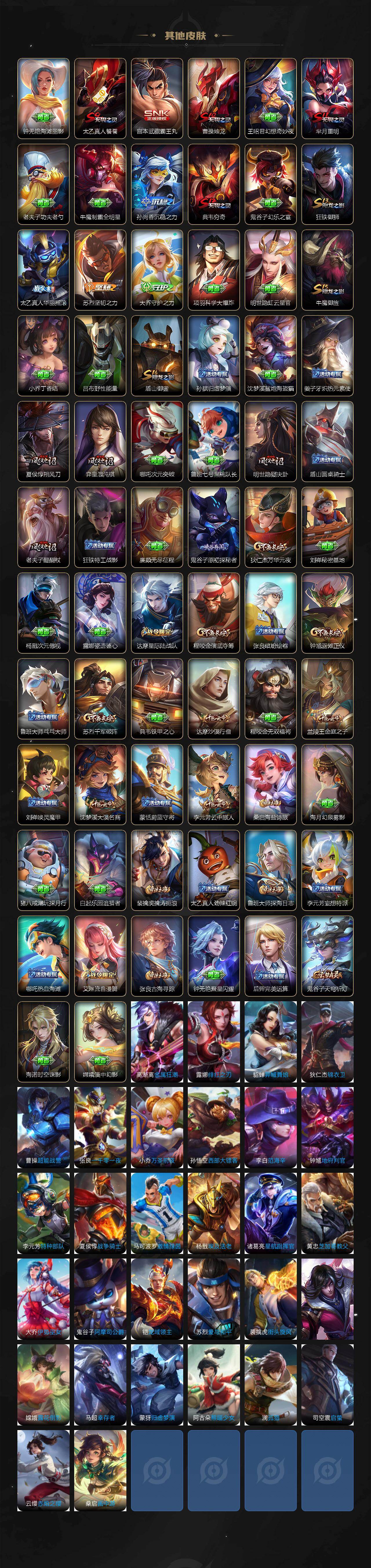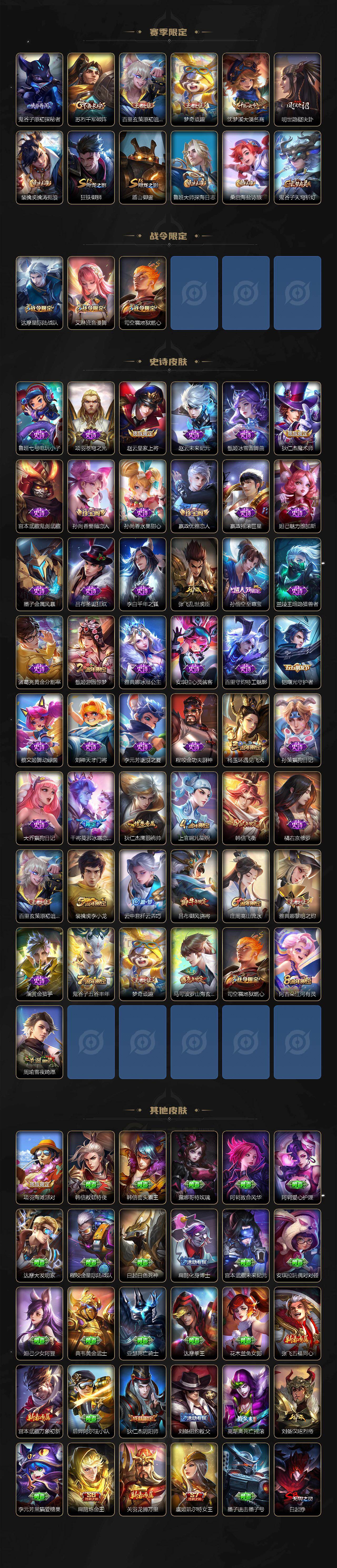 【限定皮肤】:白起狰,狄仁杰阴阳师,虞姬凯尔特女王,赵云皇家上将,嬴政优雅恋人,孙尚香蔷薇恋人,庄周高山流水,高渐离死亡摇滚,扁鹊炼金王,芈月重明,吕布御风骁将,夏侯惇朔风刀,甄姬游园惊梦,曹操烛龙,典韦穷奇,马可波罗山海玄木吟,狄仁杰魔术师,狄仁杰万华元夜,达摩星际陆战队,达摩沙漠行僧,项羽海滩派对,老夫子醍醐杖,程咬金演武夺筹,韩信飞衡,兰陵王金庭之子,孙悟空至尊宝,孙悟空零号赤焰,牛魔御旌,李元芳云中旅人,钟馗驱傩正仪,杨玉环遇见飞天,干将莫邪冰霜恋舞曲,雅典娜黎明之约,太乙真人饕餮,太乙真人华丽摇滚,鬼谷子原初探秘者,鬼谷子五谷丰年,苏烈千军破阵,百里玄策原初追逐者,弈星混沌棋,梦奇顽趣,沈梦溪大漠名商,明世隐疑决卦,裴擒虎李小龙,裴擒虎擒涛扼浪,狂铁御狮,云中君纤云弄巧,盾山御銮,上官婉儿梁祝,鲁班大师探海日志,桑启海盐诗旅,艾琳流音漫舞,司空震地狱燃心,阿古朵江河有灵,张良古海寻踪,鬼谷子天穹祈灯