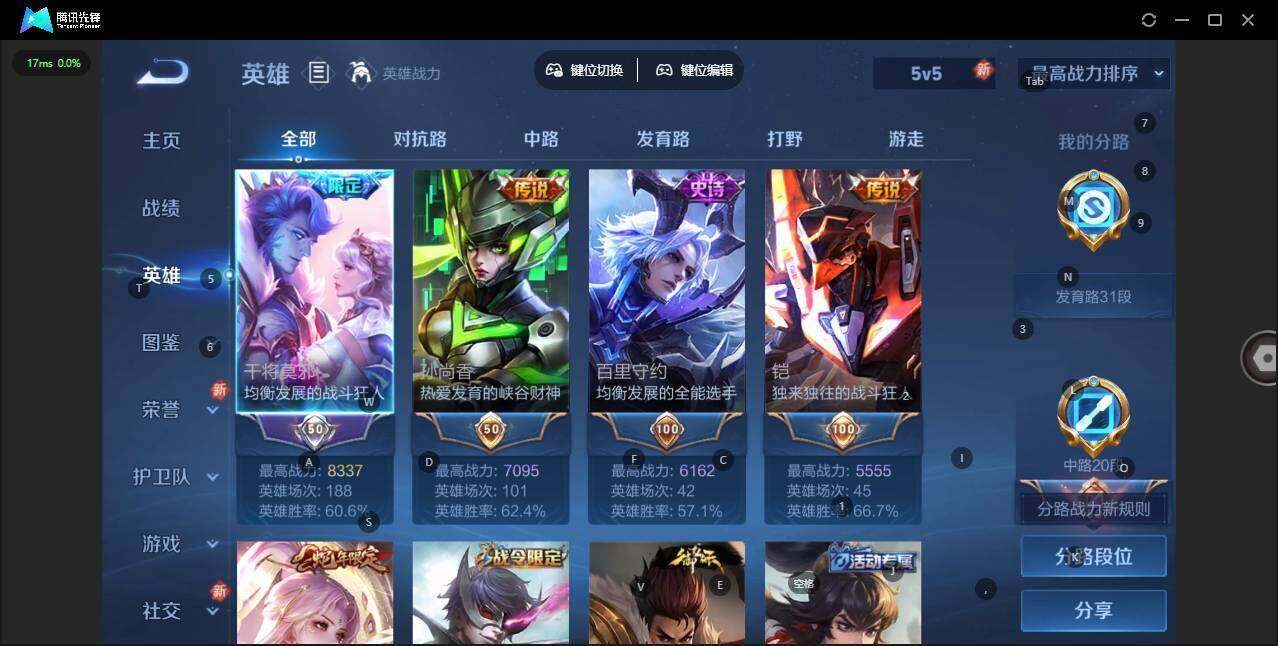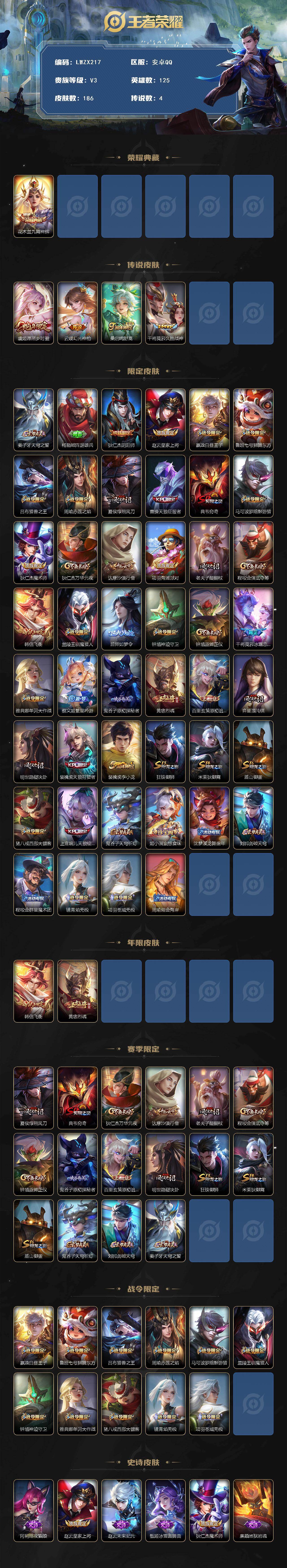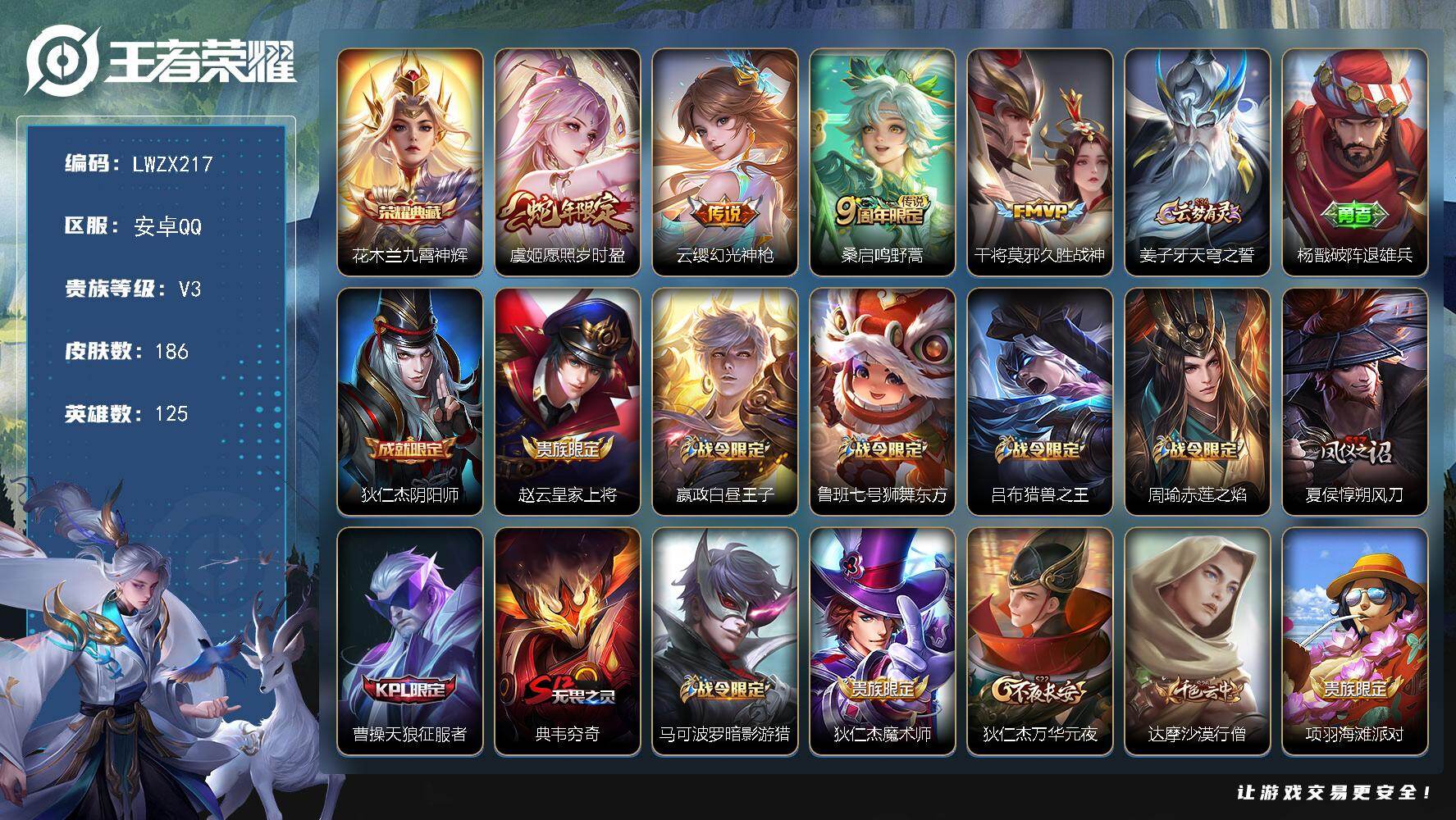 [15613192]【特价出售/店主推荐】安卓Q-V3-尊贵铂金I段位-125英雄-186皮肤-1典藏皮肤-4传说-52史诗