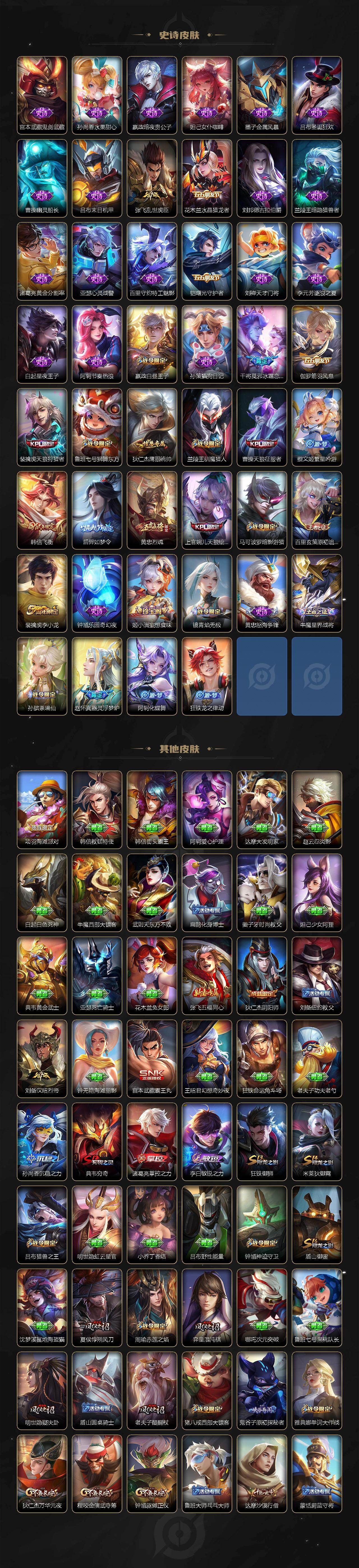 【史诗皮肤】:阿轲暗夜猫娘,赵云皇家上将,赵云未来纪元,甄姬冰雪圆舞曲,狄仁杰魔术师,廉颇地狱岩魂,宫本武藏鬼剑武藏,孙尚香水果甜心,嬴政暗夜贵公子,妲己女仆咖啡,墨子金属风暴,吕布圣诞狂欢,曹操幽灵船长,吕布末日机甲,张飞乱世虎臣,花木兰水晶猎龙者,刘邦德古拉伯爵,兰陵王暗隐猎兽者,诸葛亮黄金分割率,亚瑟心灵战警,百里守约特工魅影,铠曙光守护者,刘禅天才门将,李元芳逐浪之夏,白起星夜王子,阿轲节奏热浪,嬴政白昼王子,孙策猫狗日记,干将莫邪冰霜恋舞曲,伽罗箭羽风息,裴擒虎天狼狩猎者,鲁班七号狮舞东方,狄仁杰鹰眼统帅,兰陵王驯魔猎人,曹操天狼征服者,蔡文姬繁星吟游,韩信飞衡,后羿如梦令,黄忠烈