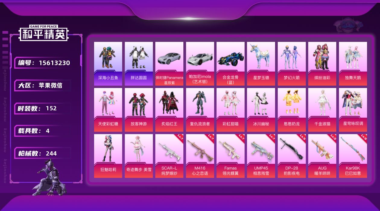 [15613230]千金淑猫-苹果 微信-14粉装-9特效枪-4载具-6粉色飞行器-79908热力值-18王牌印记-152套装-244枪皮-